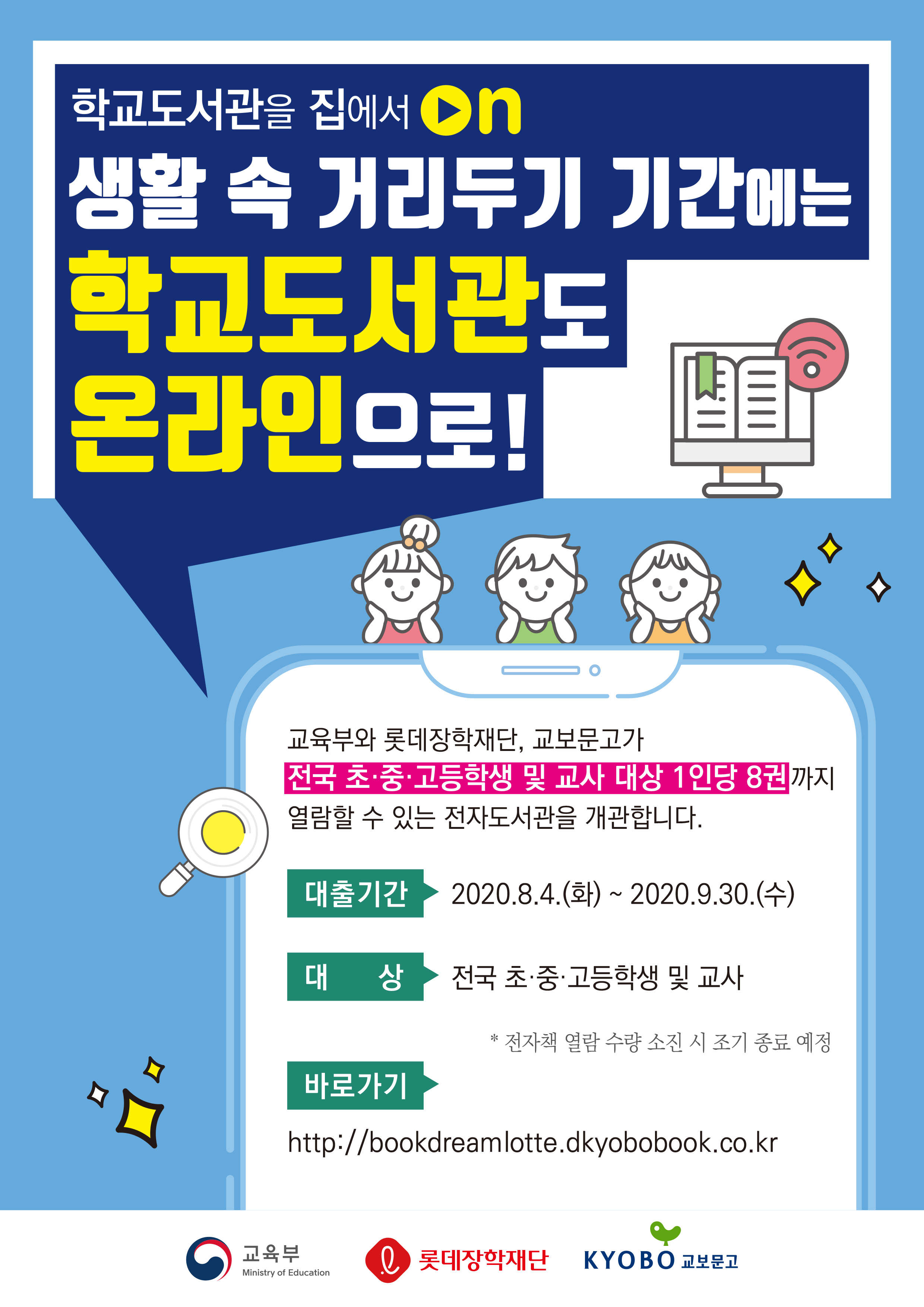 독서교육종합지원시스템에서 전국 초중고 학생 및 교사를 대상으로 전자도서관을 개관합니다. (상세내용은 이미지를 참고해주세요.) 독서교육종합지원시스템에서 로그인된 상태로 이미지를 선택하면, 전자도서관을 바로 이용할 수 있습니다. (별도로 로그인하지 않아도 됩니다.) 바로가기 주소 : http://bookdreamlotte.dkyobobook.co.kr