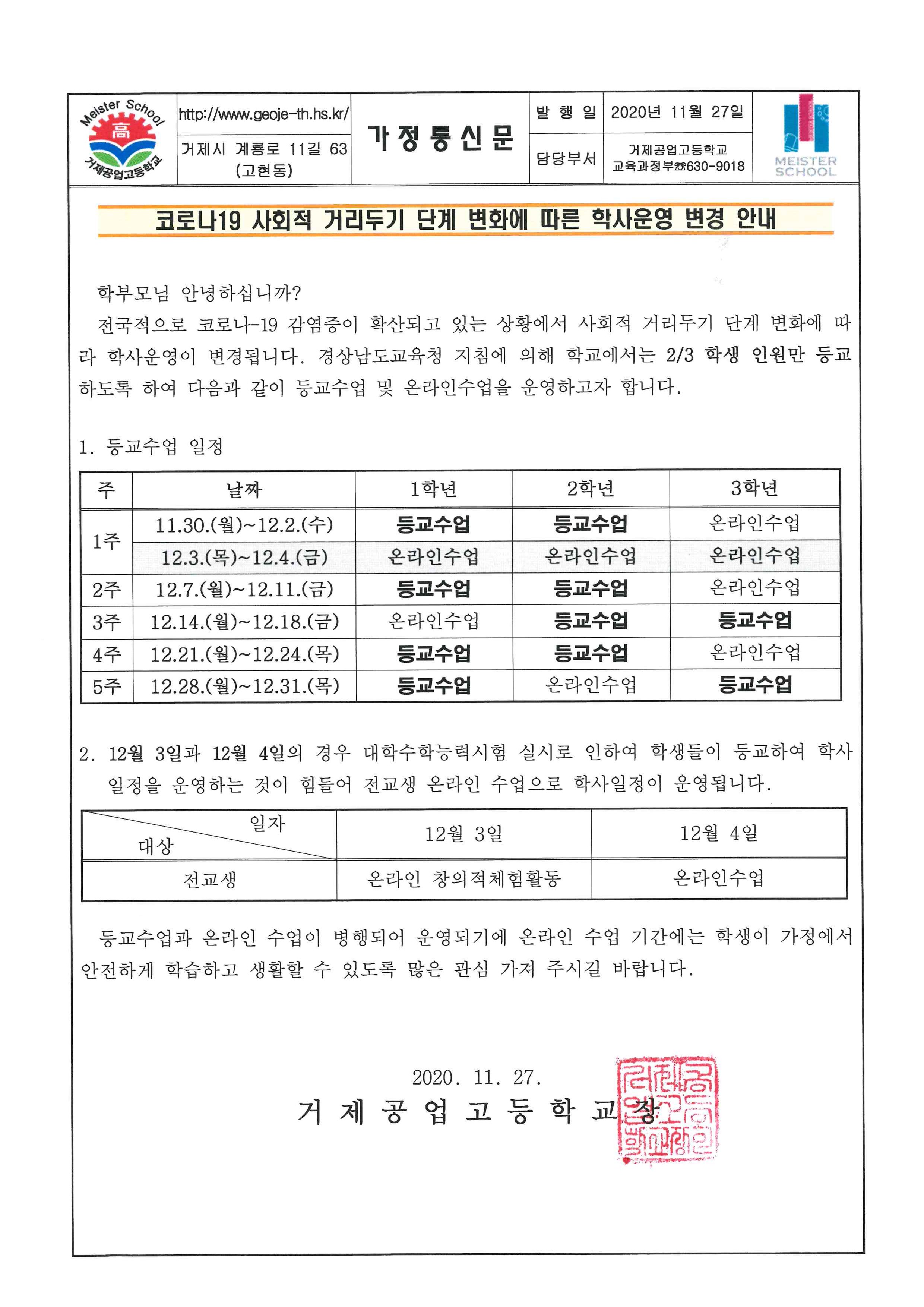코로나19 사회적 거리두기 단계 변화에 따른 학사운영 변경 안내 가정통신문
