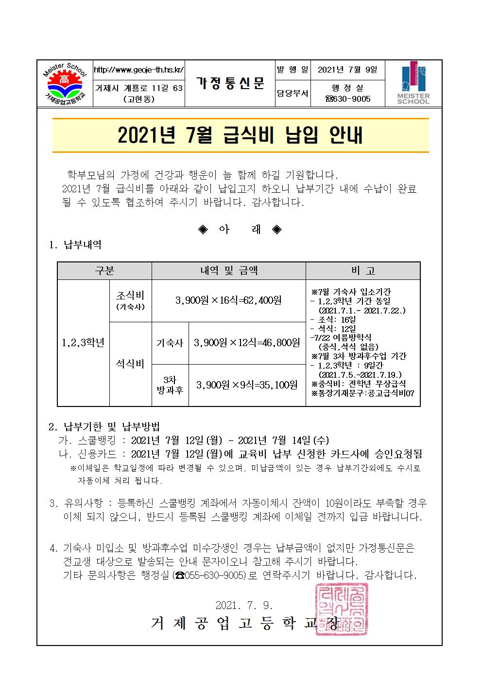 2021년 7월 급식비(조식 및 석식) 납입안내