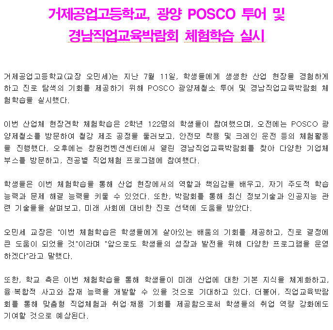 [보도자료] 2024. 광양 POSCO 투어 및 경남직업교육박람회 체험학습 실시