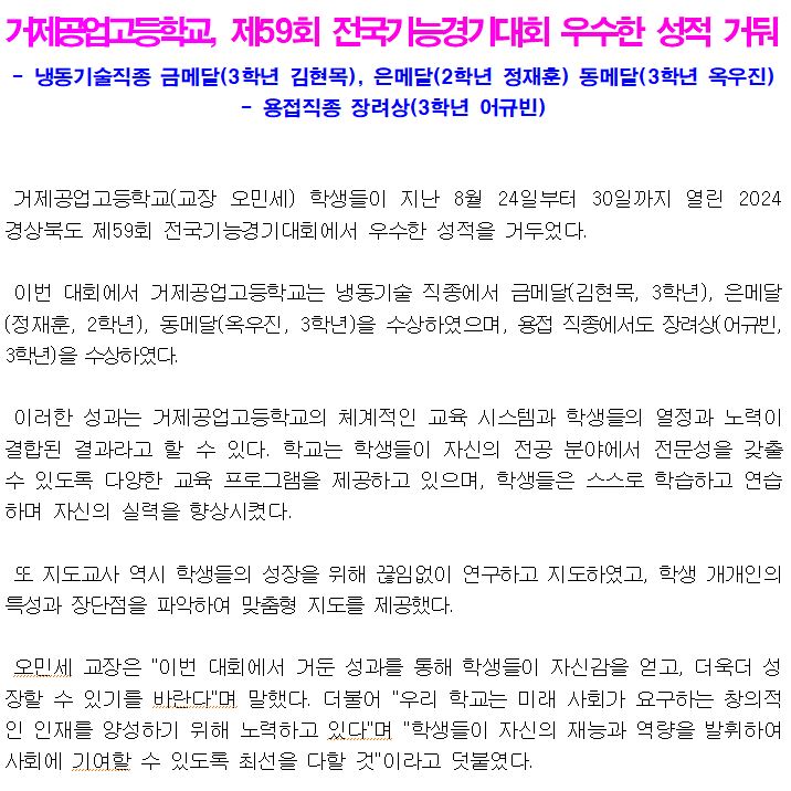 [보도자료] 거제공업고등학교, 2024 경남기능경기대회 쾌거