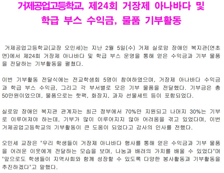 [보도자료] 제24회 거장제 아나바다 및 학급 부스 수익금 및 물품 기부활동 보도자료