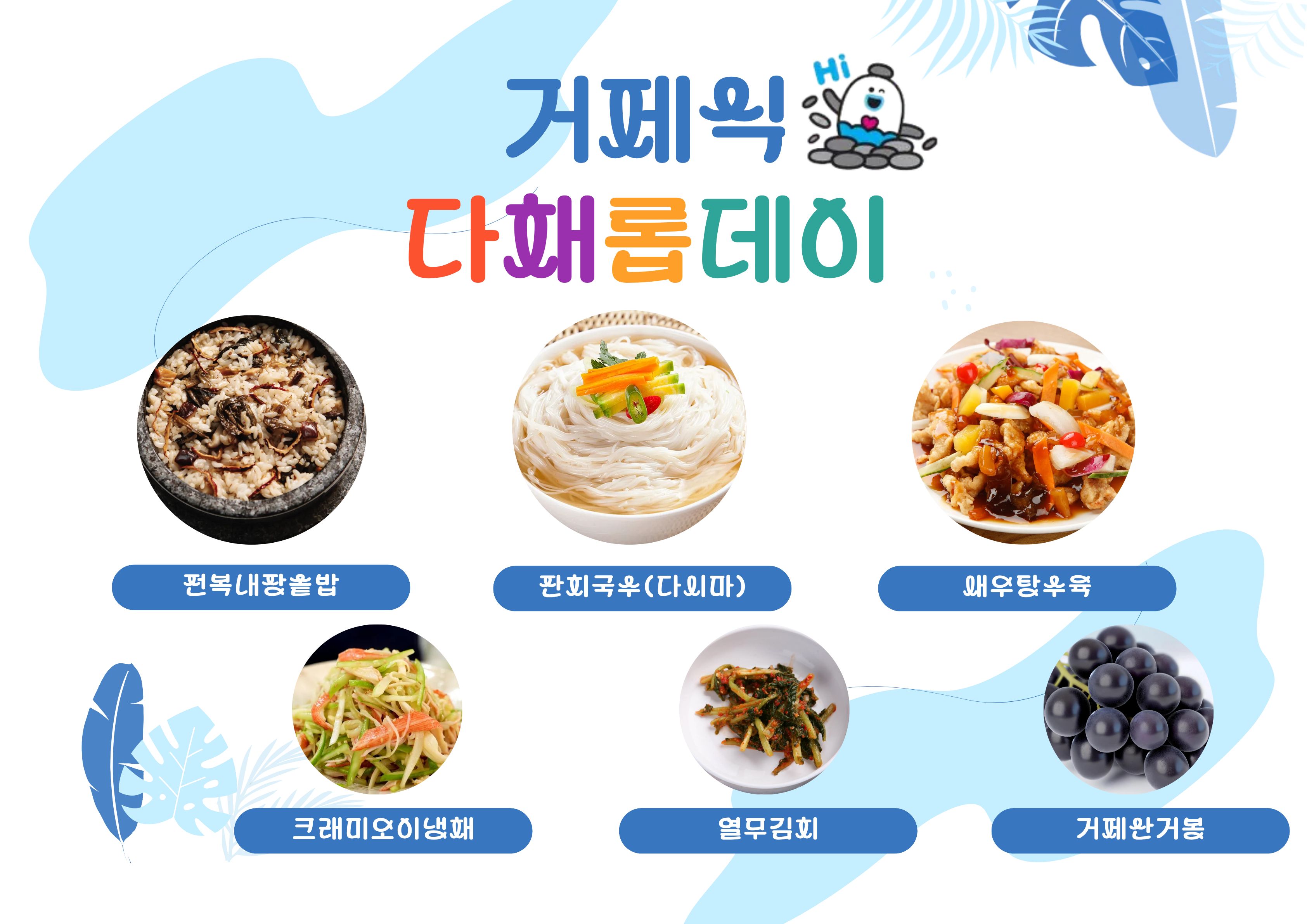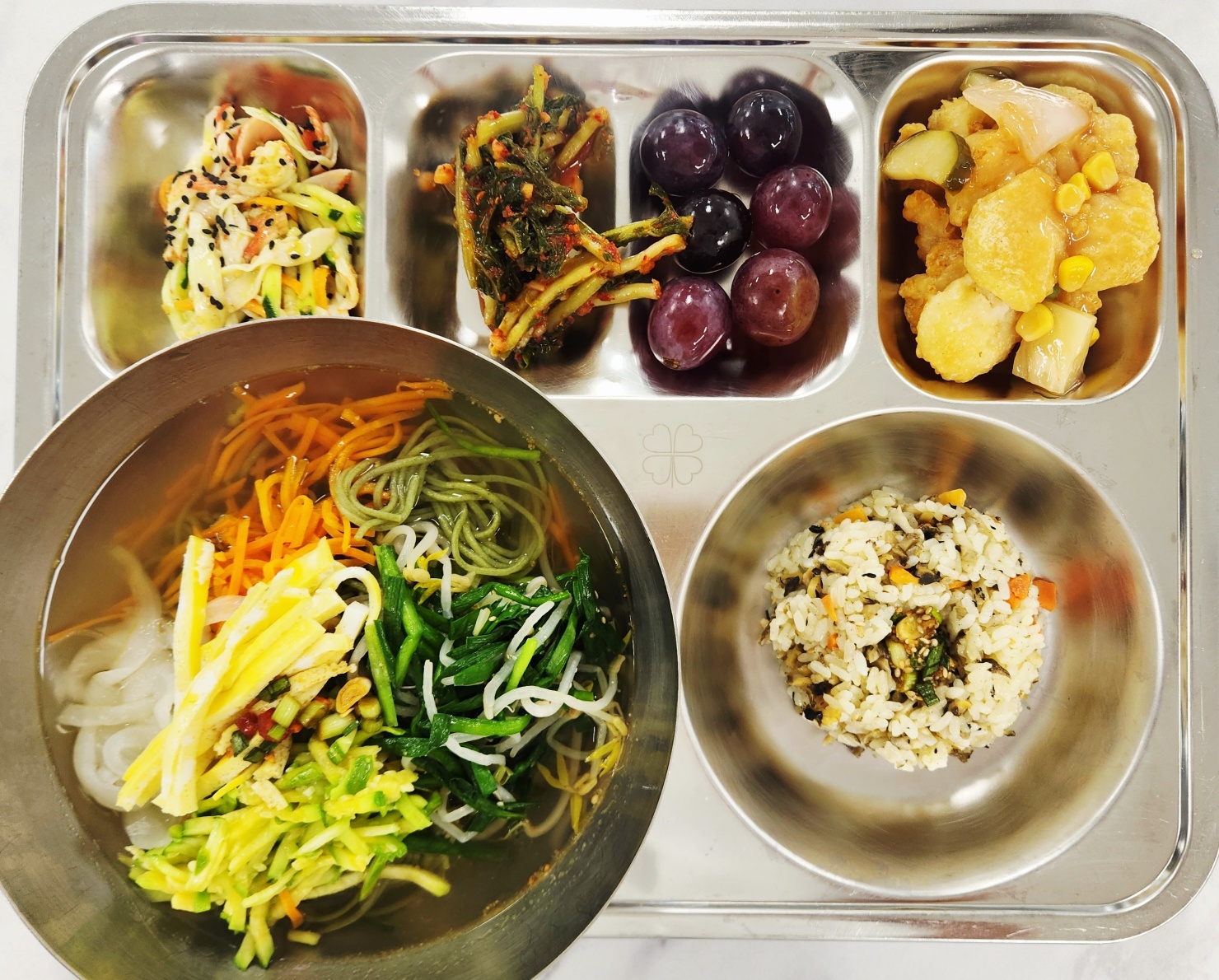 [거제식다채롭데이]중식 전복내장솥밥(미니)(2.5.6.13.16.18) 잔치국수(다시마)/면기(1.5.6.9) 크래미오이냉채(자율)(13) 새우탕수육(완)(1.5.6.9.12.13) 열무김치(9)거봉 * 에너지/단백질/칼슘/철 943.7/31.2/176.8/4.0