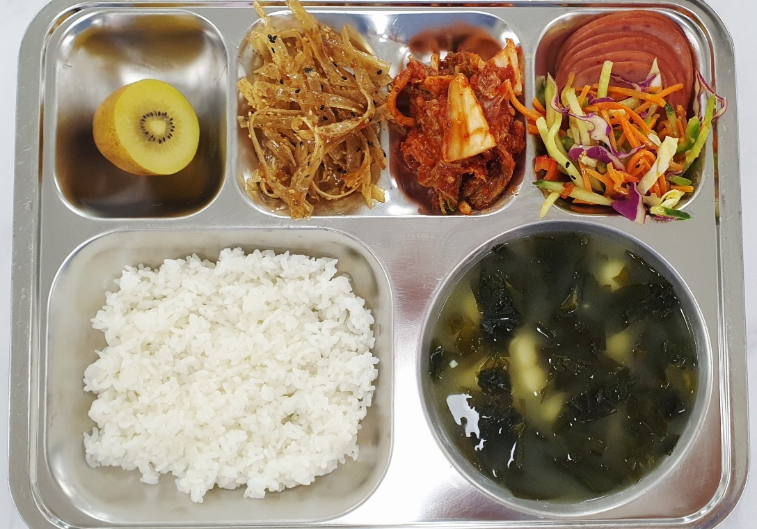 -조식 친환경쌀밥(조) 조랭이떡미역국(5.6) 싸먹는오리훈제&야채(조)(1.2.5.6.13) 명엽채볶음(자율)(5.6.13) 배추김치(자율)(9) 골드키위
