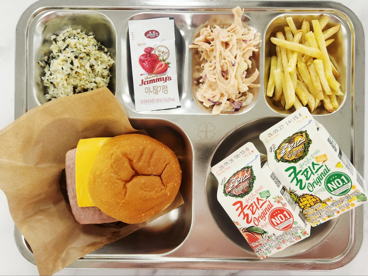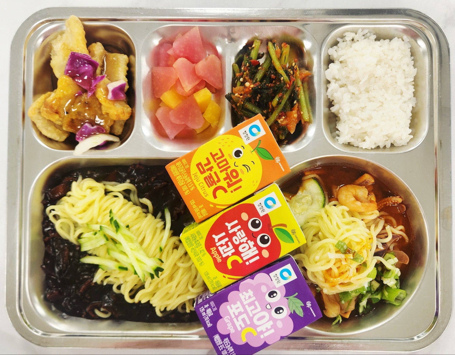중식 자율밥 자장면(밥칸)&짬뽕(국칸)(2.5.6.9.10.13.16.17.18) 열무겉절이(자율)(13) 찹쌀꿔바로우(1.5.6.10.12.13.18) 골라먹는주스(사과,감귤,포도)(2.11.13) 심쿵단무지 * 에너지/단백질/칼슘/철 1,039.7/39.6/313.9/2.5