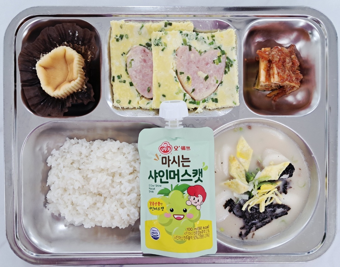 조식 친환경쌀밥(조) 미니바스크치즈케이크(1.2.5.6) 사골떡국(조)(1.16) 하트햄전(1.2.5.6.10.15.16) 배추김치(조)(9) 샤인머스캣주스(13)