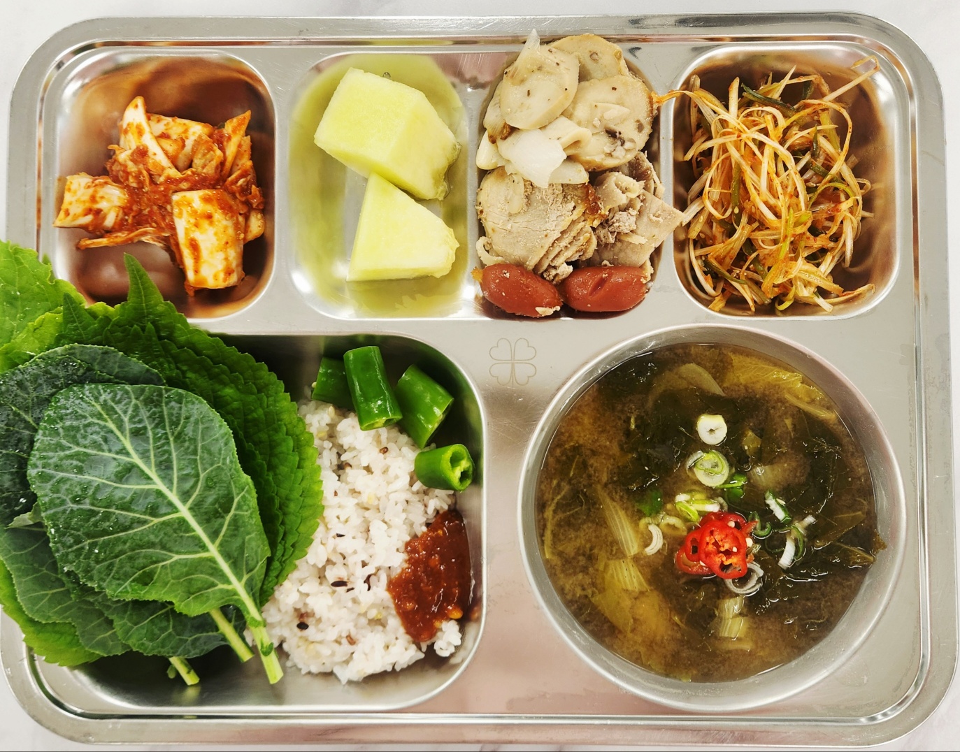 오색현미밥시락국(땡초)(5.6)파채무침(자율)(13)*모듬캠핑구이(2.5.6.10.15.16)배추겉절이김치(9)야채쌈&쌈장멜론에너지/단백질/칼슘/철1,070.1/34.5/196.7/2.8