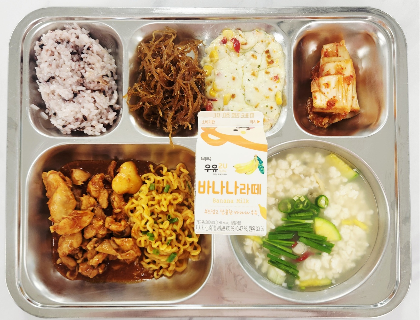 중식 숯불치킨&라면사리(1.5.6.12.13.15) 흑미밥 몽글순두부백탕(5.6.18) 우엉조림(자율)(5.6.13) 콘치즈구이(1.2.5.6.10.15.16) 배추김치(자율)(9) 바나나라떼(2) * 에너지/단백질/칼슘/철 838.9/45.0/210.9/2.8