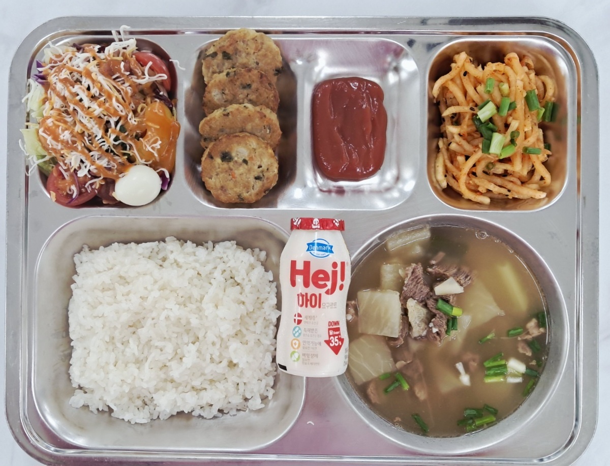 조식 친환경쌀밥(조) 쇠고기뭇국(조)(5.6.16) 무생채-자율(13) 칠리베이컨샐러드.(1.2.5.6.10.12.13) 계란옷입은동그랑땡.(1.2.5.6.10.12.15.16) 저당요구르트(2)