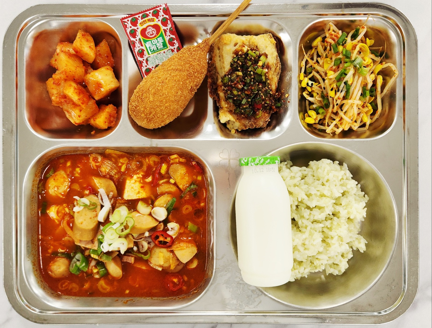 중식 클로렐라밥 바사삭미니핫도그(1.2.5.6.10.12.15.18) 모듬햄찌개(1.2.5.6.9.10.13.15.16) 매콤콩나물무침(5.6.18) 임연수구이&양념장(5.6.13) 깍두기(9) 장건강요구르트(2) * 에너지/단백질/칼슘/철 961.0/44.6/163.6/5.7
