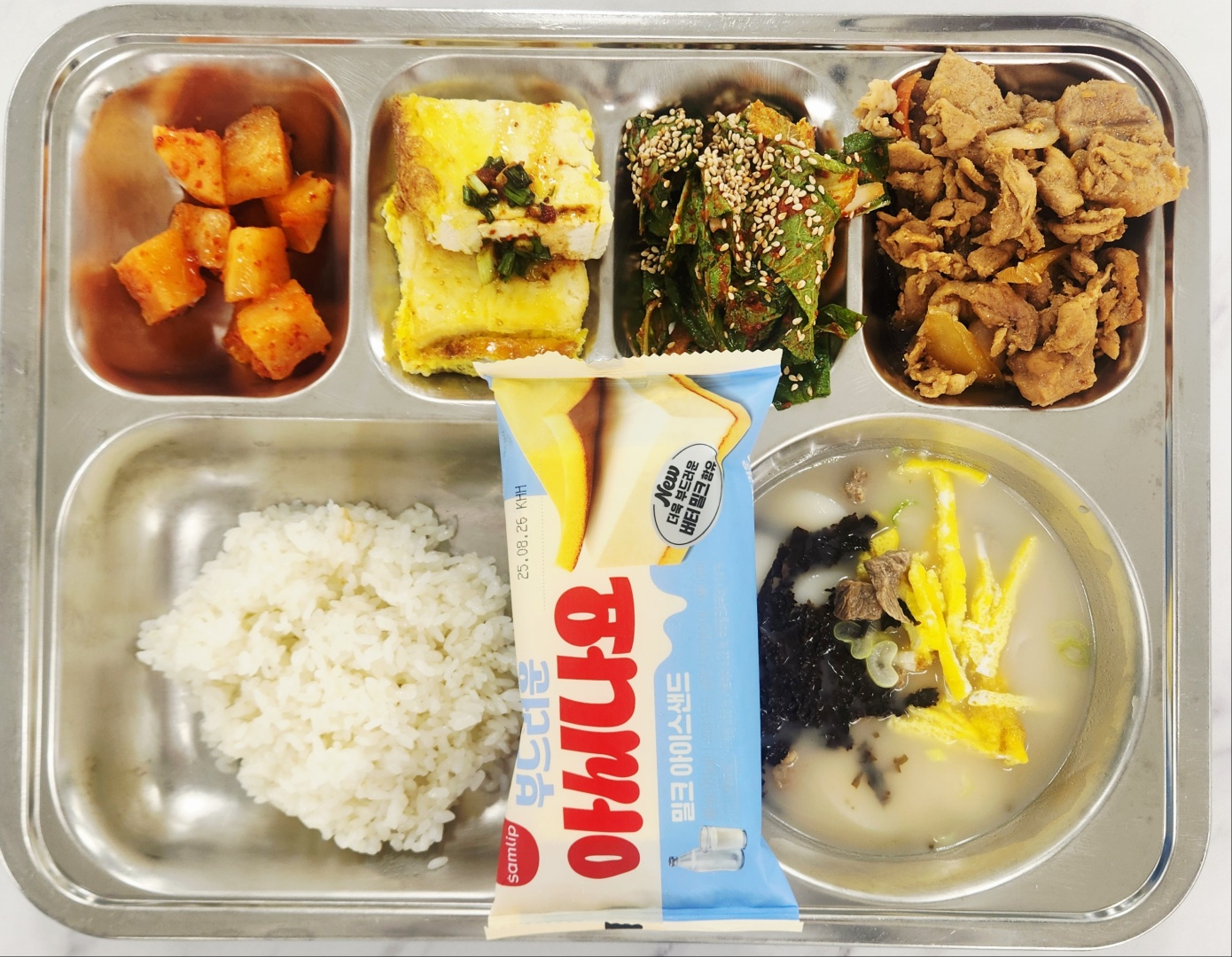석식 친환경쌀밥(조) 사골떡국(조)(1.16) 얼갈이양파겉절이(자율)(5.6.13) 간장불고기(2.5.6.10.13) 두부계란구이(1.5.6) 깍두기(9) 아이스크림샌드(1.2.5.6)