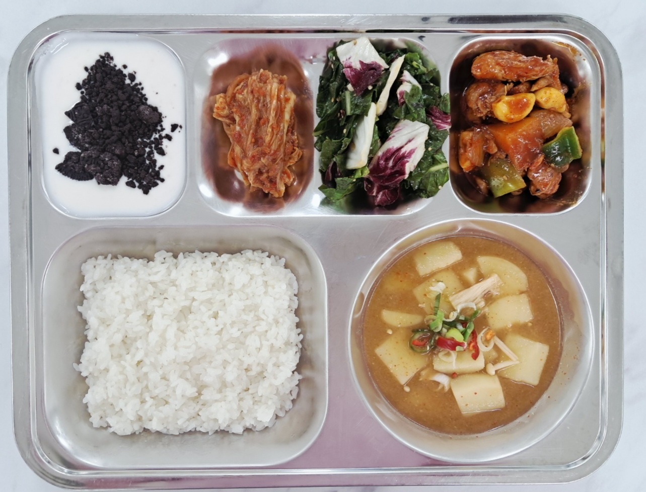 조식 친환경쌀밥(조) 감자된장국(조)(5.6) 통마늘찜닭(조)(5.6.13.15) 상추겉절이(자율)(5.6.13) 배추김치(조)(9) 토핑요거트(1.2.4.5.6)