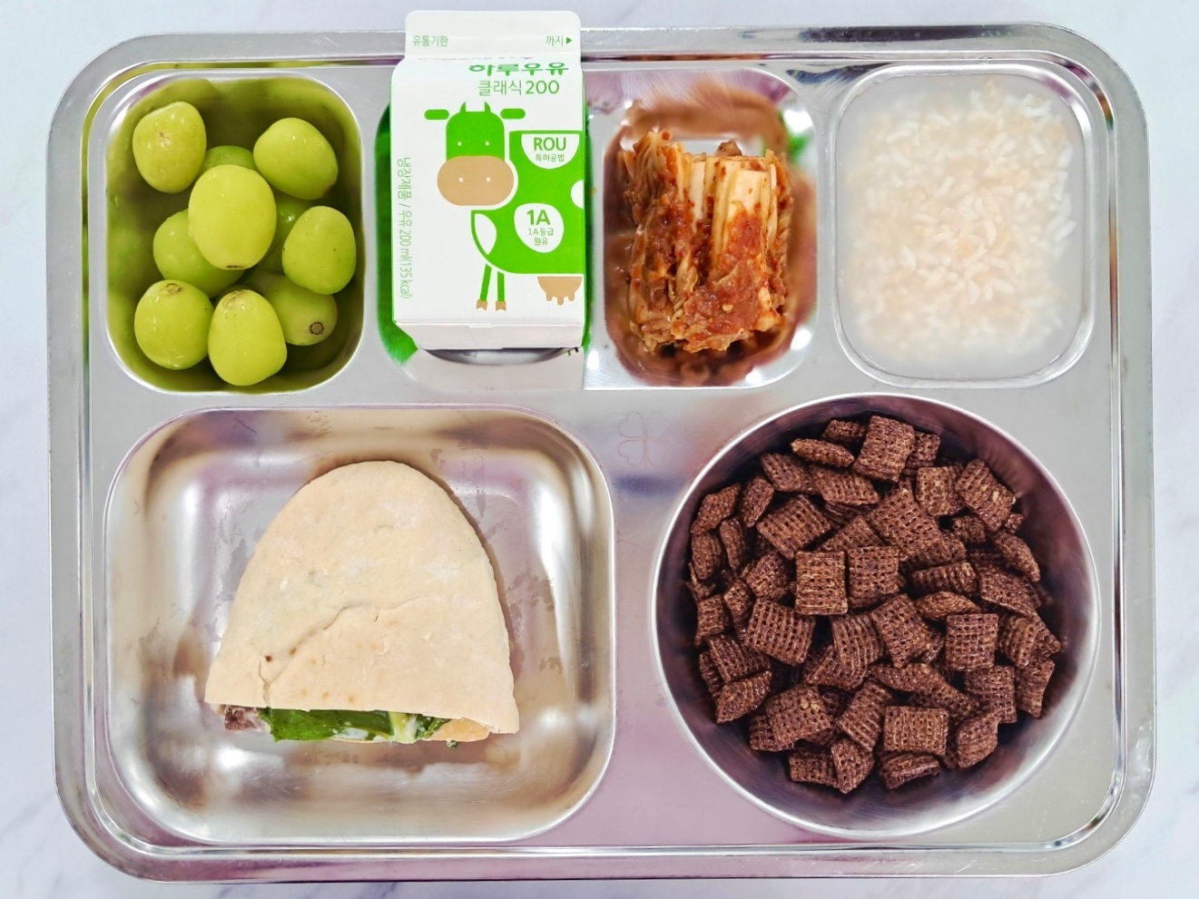 떡갈비포켓샌드위치(1.2.5.6.16)숭늉&김치(9)초코시리얼(2.5.6)우유(2)샤인머스캣