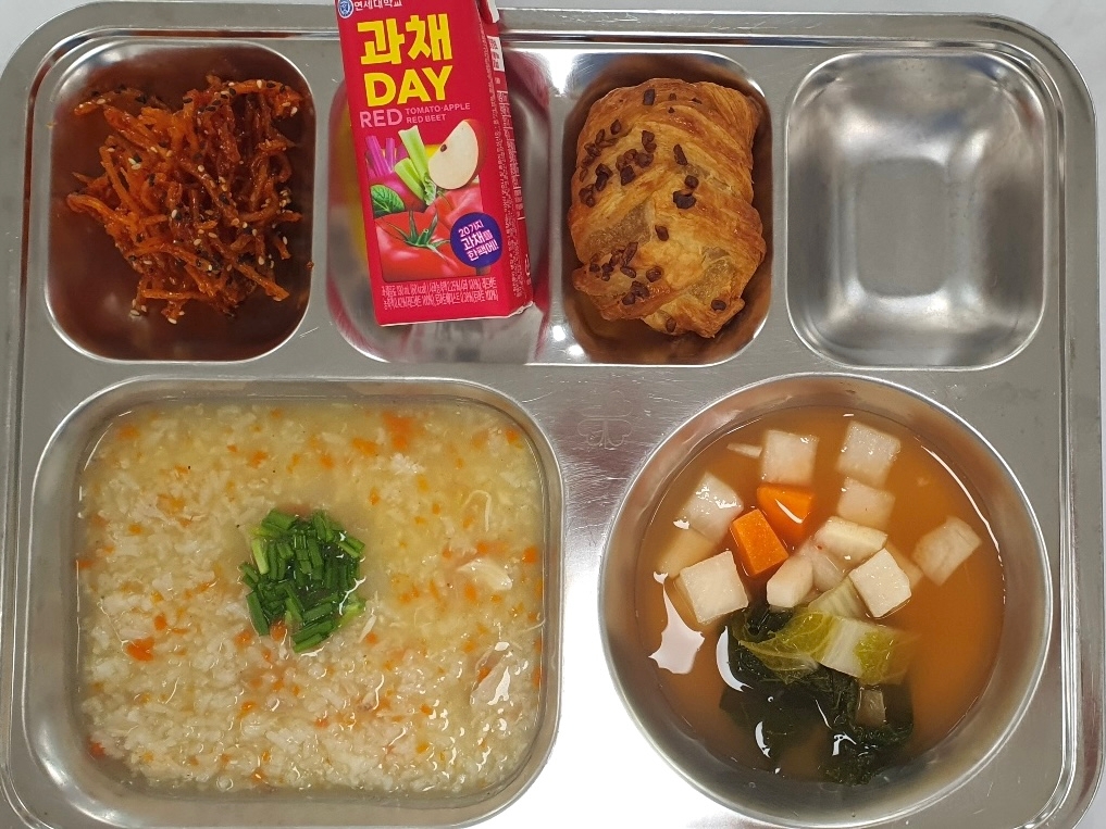 [조식] 영양닭죽(15) 일미채무침(5.6.13.17) 나박물김치(9) 메이플피칸파이(1.2.5.6.14) 과채주스(13)