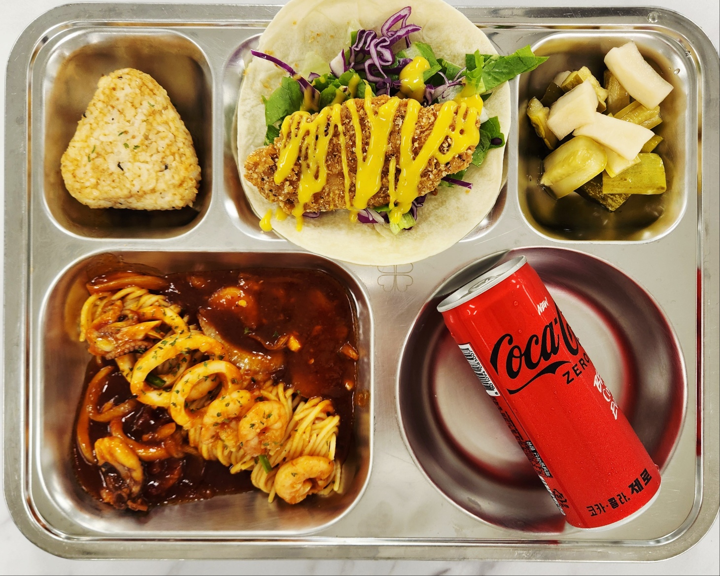 [석식] 참치마요구운주먹밥(1.2.5.6.10) 상하이파스타(1.5.6.9.10.12.13.16.17.18) 치킨텐더스낵랩(1.2.5.6.15) 수제오이피클(13) 제로음료