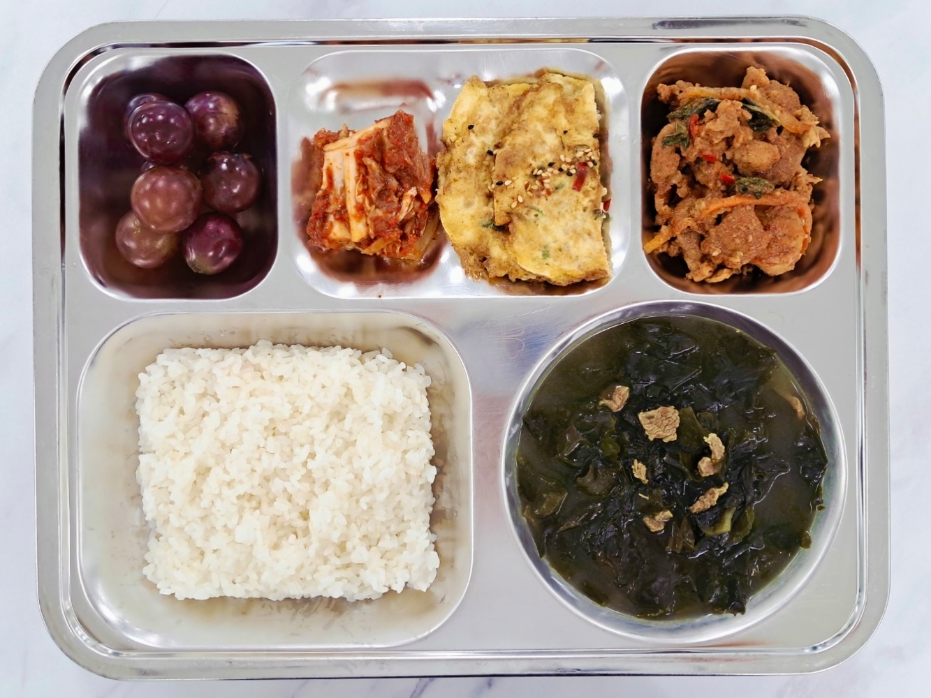 [조식] 친환경쌀밥 한우미역국(16) 돈육고추장불고기(5.6.10.13) 팽이버섯달걀전(1.5.6.13) 배추김치(9) 거봉