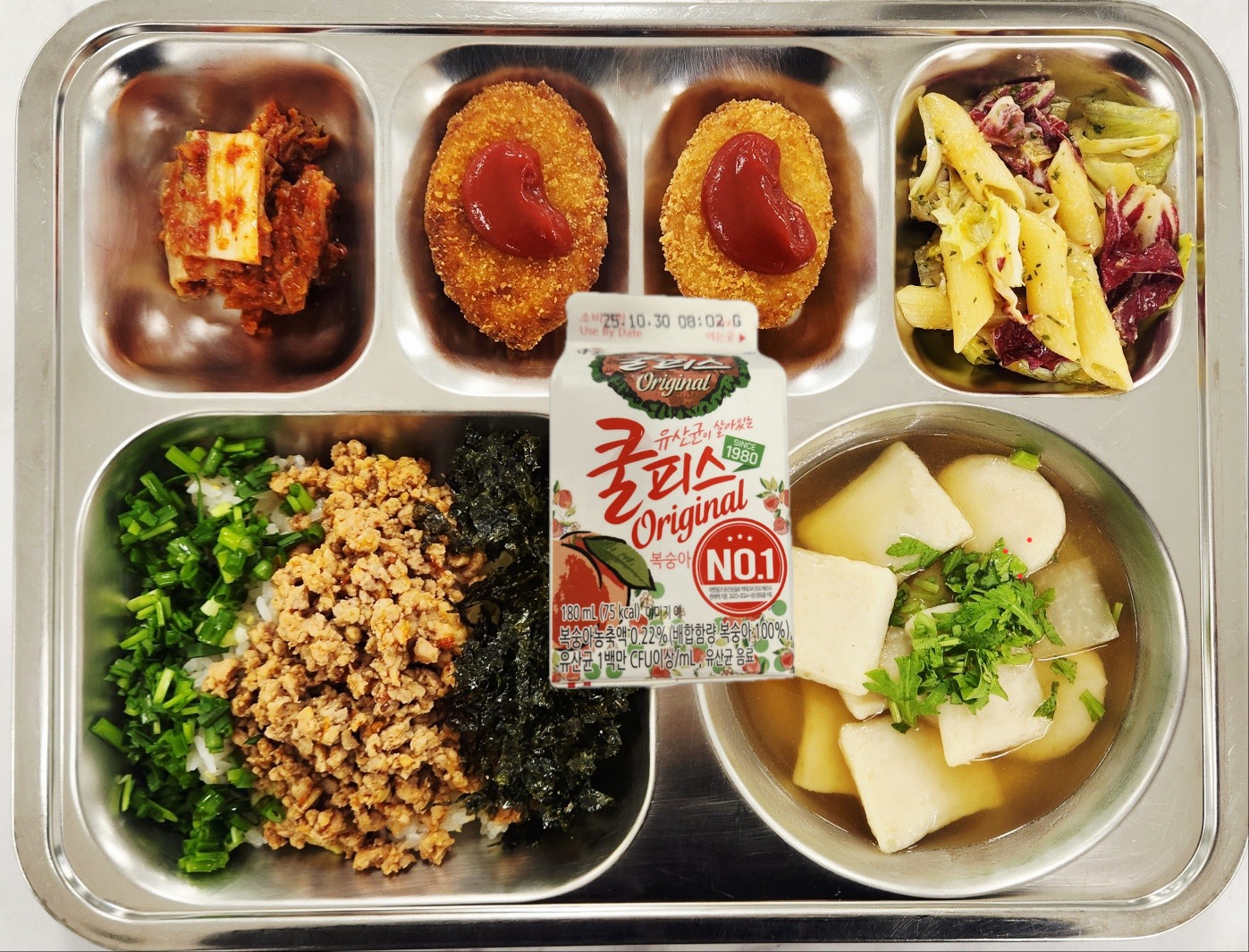 [석식] 마제덮밥(1.5.6.10.12.13.18) 어묵탕(1.5.6) 샐러드펜네파스타(1.2.5.6.12.13) 고로케튀김(1.5.6.12) 배추김치(9) 복숭아맛음료(2)
