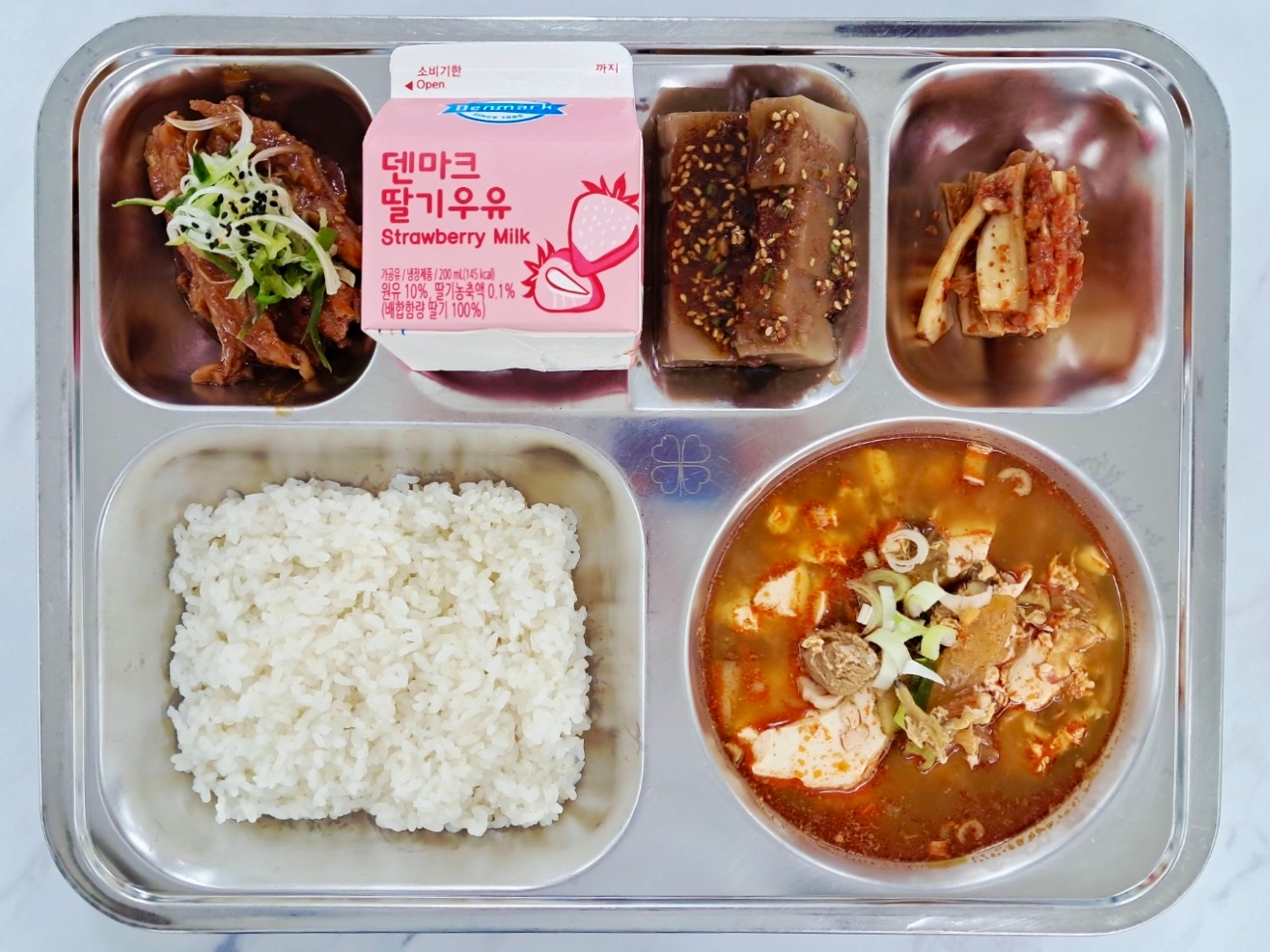 친환경쌀밥순두부찌개(1.5.6.9.10.13.18)닭목살불고기(5.6.12.13.15)도토리묵&양념장(5.6.13)배추김치(9)딸기우유(2)