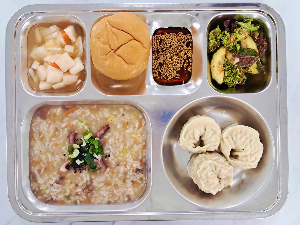 [조식] 불낙죽(5.6.16) 얇은피만두찜&초간장(1.5.6.10.13.16.18) 모듬야채겉절이(13) 나박물김치(9) 딸기생크림빵(1.2.5.6)
