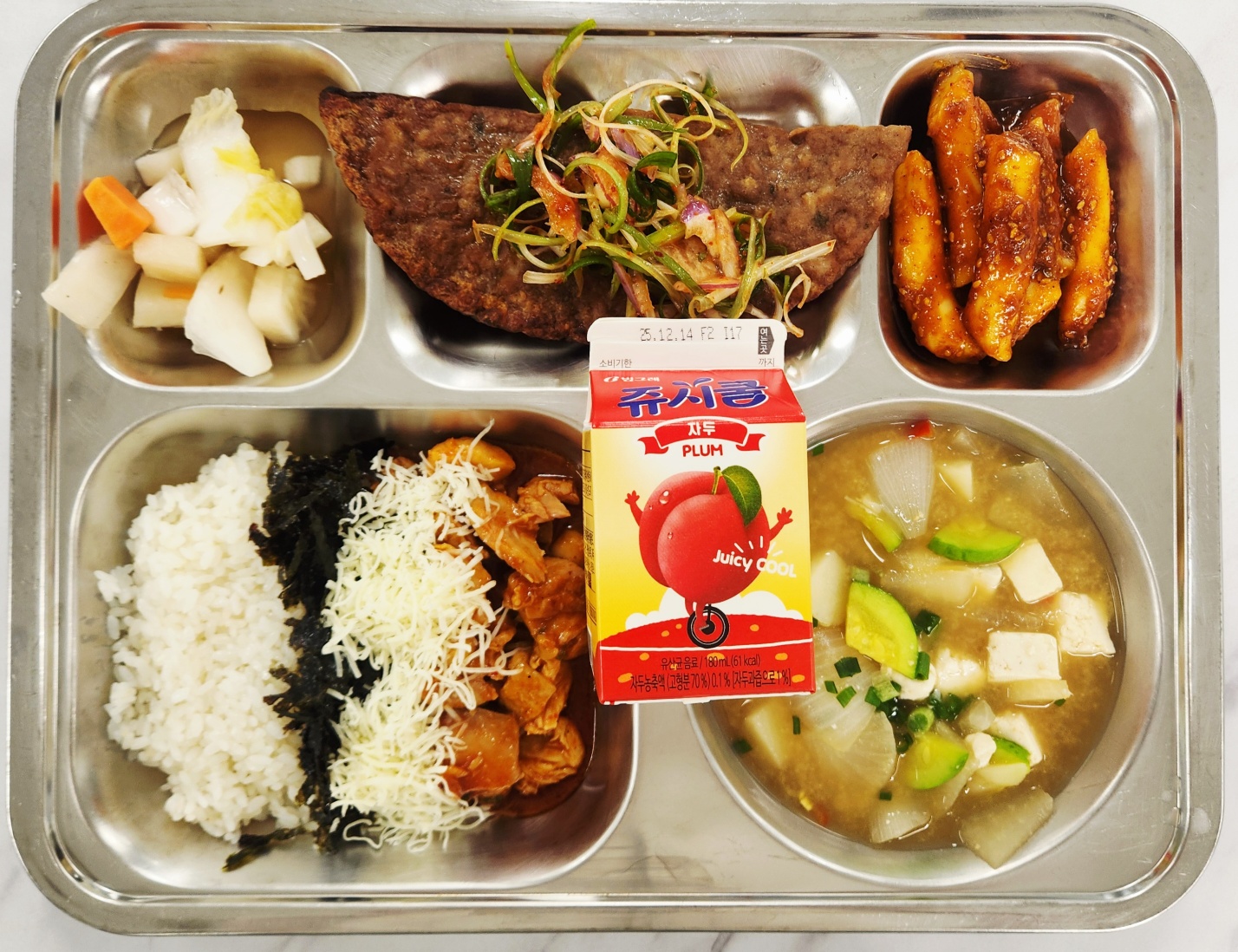 [석식] 바베큐맛치킨덮밥 (2.5.6.12.13.15.16.18) 두부된장국(5.6) 언양식반달불고기&파채 (5.6.10.13.15.16.18) 기름떡볶이 나박물김치(9) 자두맛음료(2)