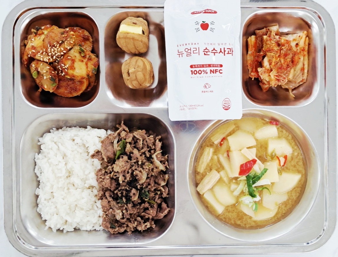 조식 친환경쌀밥(조) 감자된장국(조)(5.6) 목심불고기덮밥(2.5.6.13.16) 구운새송이버섯무침 호두과자(앙버터&팥)(1.2.5.6.14) 배추김치(자율)(9) 사과착즙주스(13)