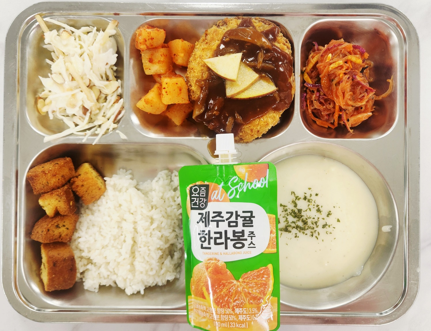 석식 친환경쌀밥 -실곤약야채무침(자율)(5.6.13) -크림스프&미니바게트(2.5.6.13.16) -사과양배추샐러드(1.2.5.6.13) -통등심돈까스(1.2.5.6.10.12.13.16.18) -깍두기(9) -한라봉감귤주스(13)