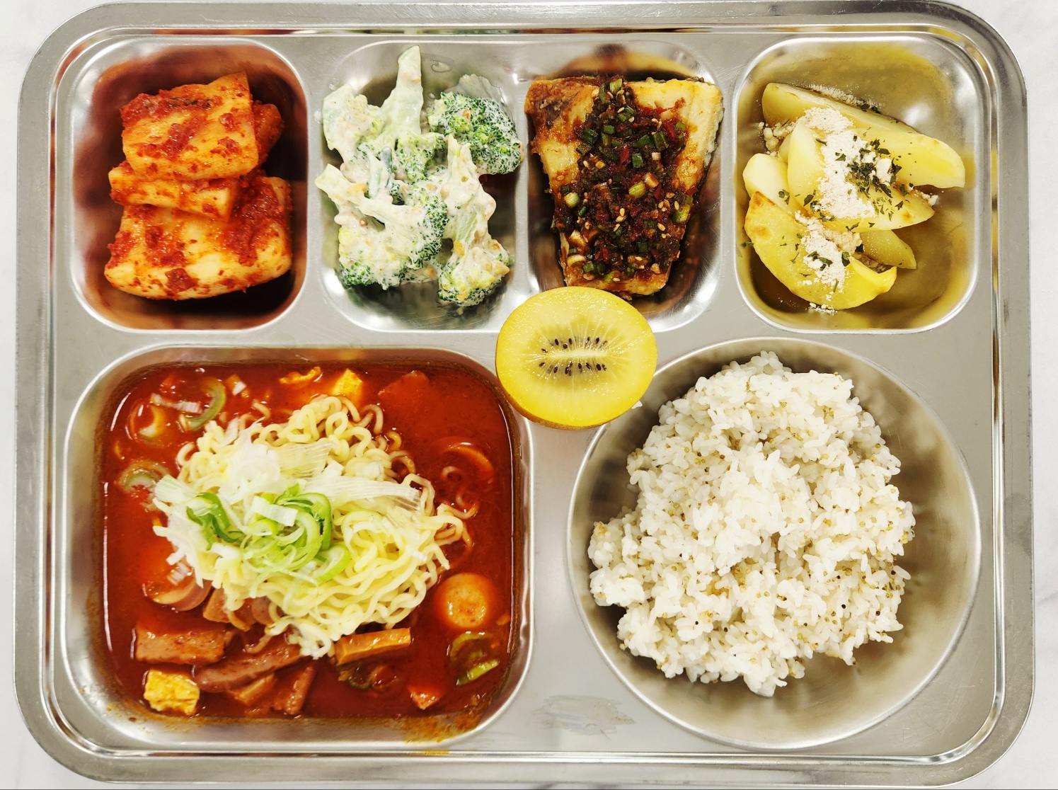중식 차조밥 부대찌개(라면사리)/밥칸(1.2.5.6.9.10.13.15.16) 브로콜리땅콩무침(자율)(1.4.5.13) 웨지감자구이 임연수구이&양념장(5.6.13) -나박김치(자율)(9) 골드키위 * 에너지/단백질/칼슘/철 885.78/43.16/114.82/7.83