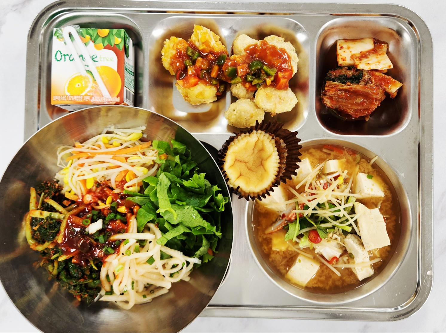 중식[다채롭데이] 열무보리비빔밥(면기)(5.6.9.13) 미니바스크치즈케이크(1.2.5.6) 꽃게탕..(5.6.8) 오징어콘볼강정(1.5.6.12.13.17) 배추김치(자율)(9) 오렌지주스(13) * 에너지/단백질/칼슘/철 969.63/35.80/328.88/4.44