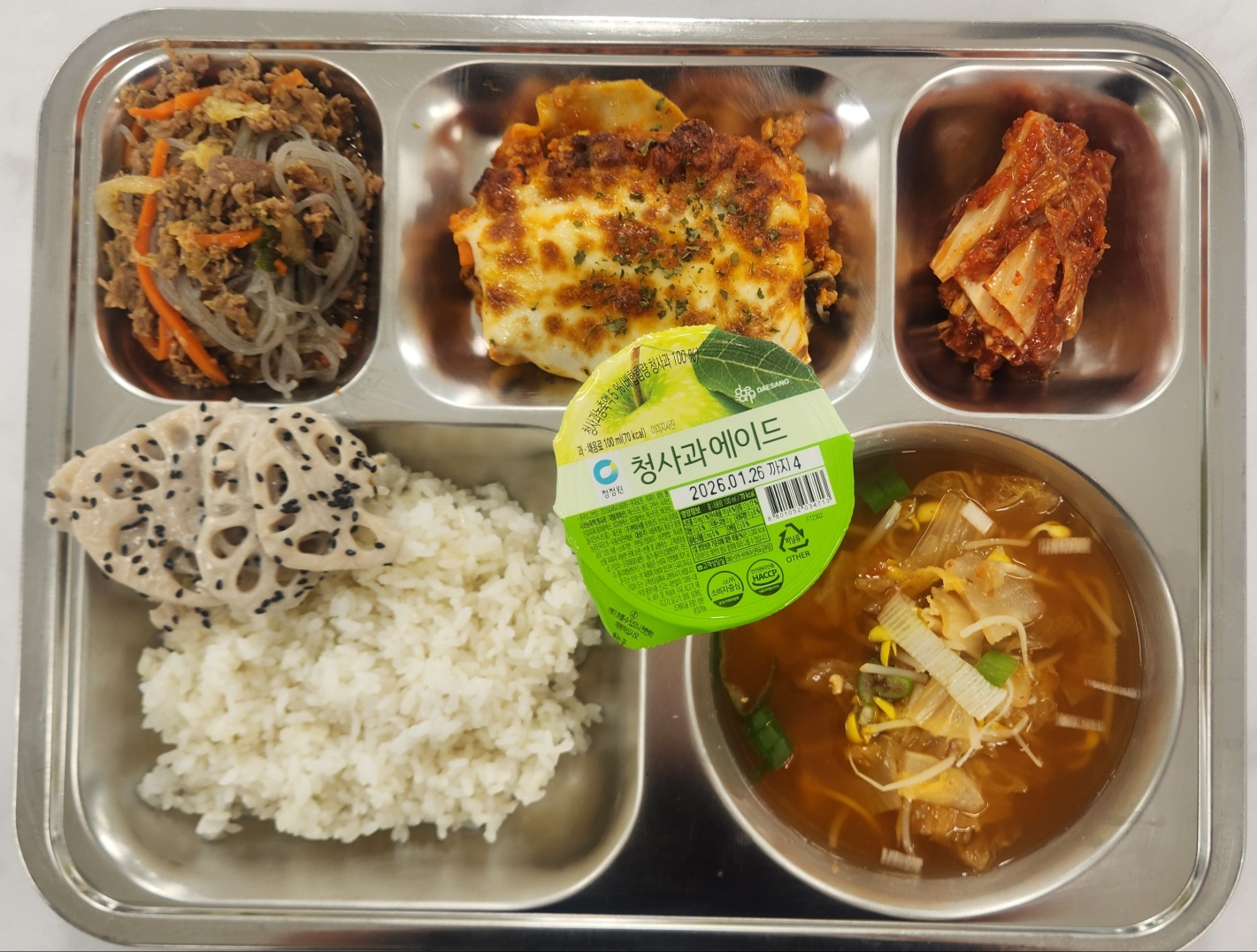 석식 친환경쌀밥(조) 김치콩나물국..(9.13) -흑임자연근무침(자율)(1.5.13) 목심납짝불고기(2.10.13.16) 가을이라자냐(1.2.5.6.10.12.13.15.16) 배추김치(조)(9) 청사과에이드(13)