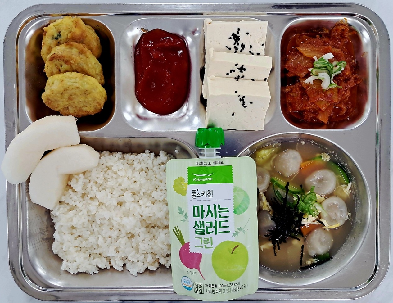 조식 친환경쌀밥(조) -방울만두국(조)(1.5.6.10.15.16.18) 온두부&볶음김치.(5.6.9.13) 계란옷입은동그랑땡.(1.2.5.6.10.12.15.16) 마시는샐러드주스(13) 조각배