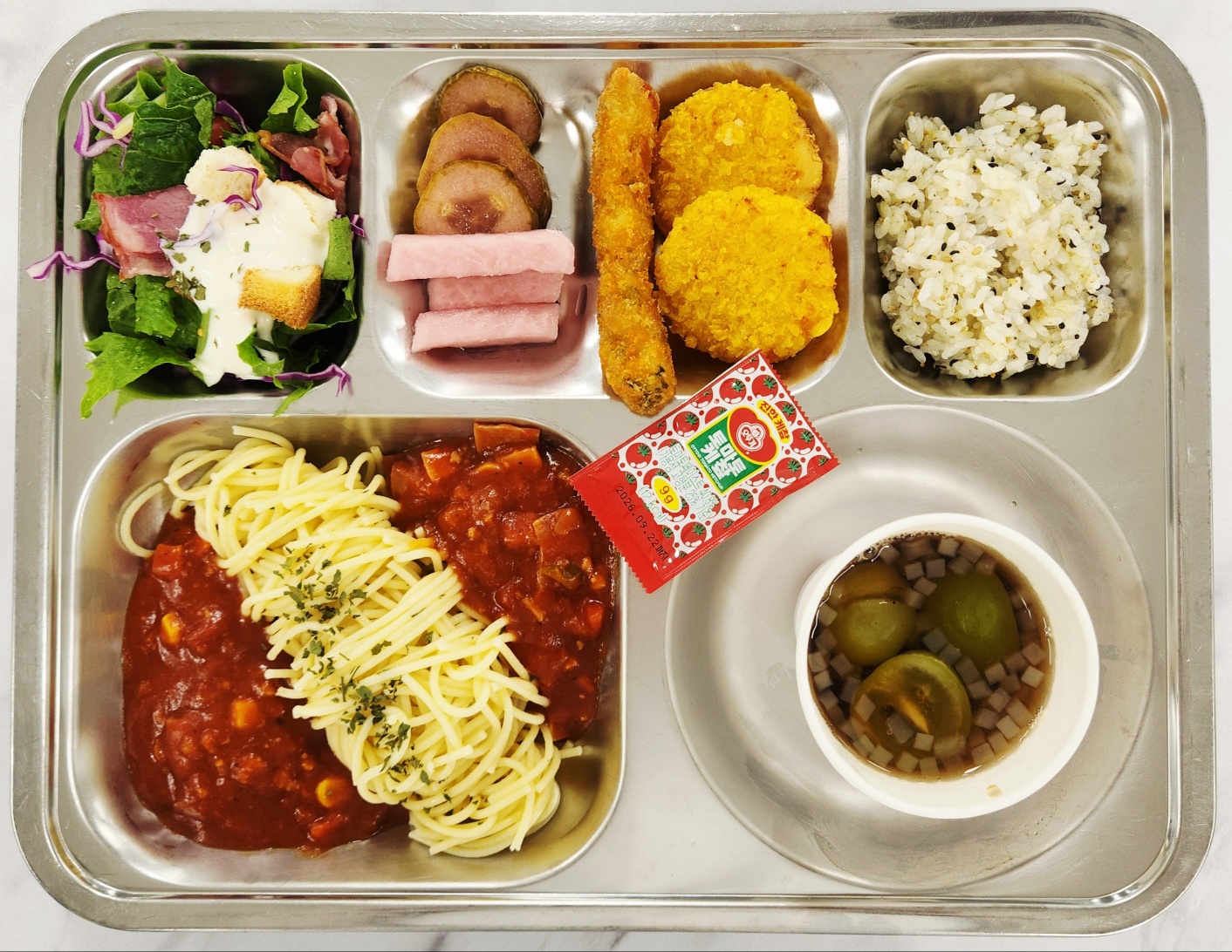 중식 후리가케주먹밥(미니)(1.2.5.6.9.13.16.18) -토마토스파게티(1.2.5.6.10.12.13.15.16) -로메인시저샐러드(1.2.5.6.10.12) -오미자믹스피클(자율) 고로케(2)&새우대파스틱(1.5.6.9.12) 아샤추(아이스티샤인추가).(11.13) * 에너지/단백질/칼슘/철 840.89/22.34/183.47/3