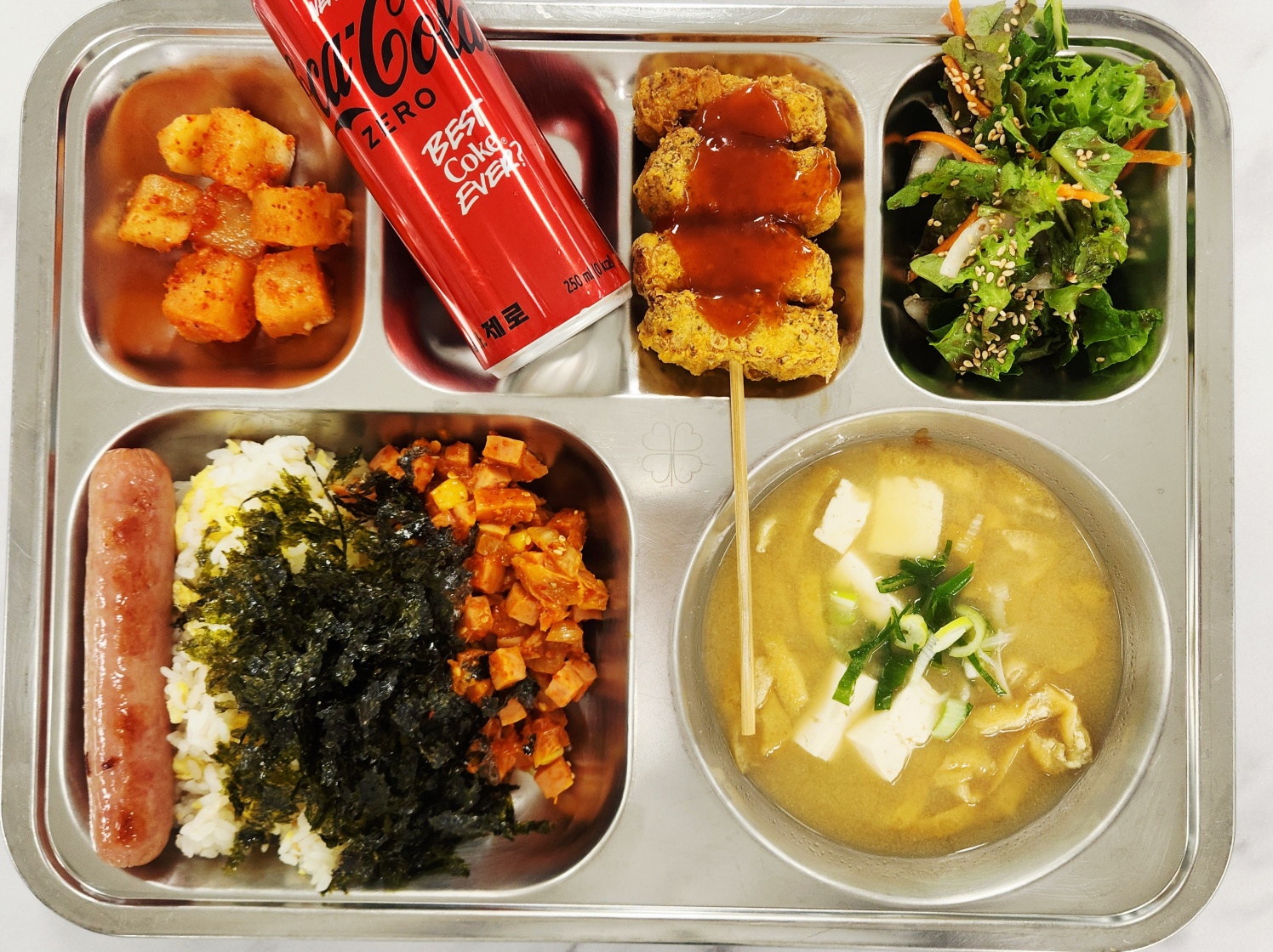 석식 햄김치마요덮밥(1.2.5.6.9.10.13.15.16) 유부팽이장국.(5.6) 야채겉절이(발사믹D).(1.2.5.6) 치킨꼬지(2.5.6.15.16) -깍두기(9) 제로음료(13)