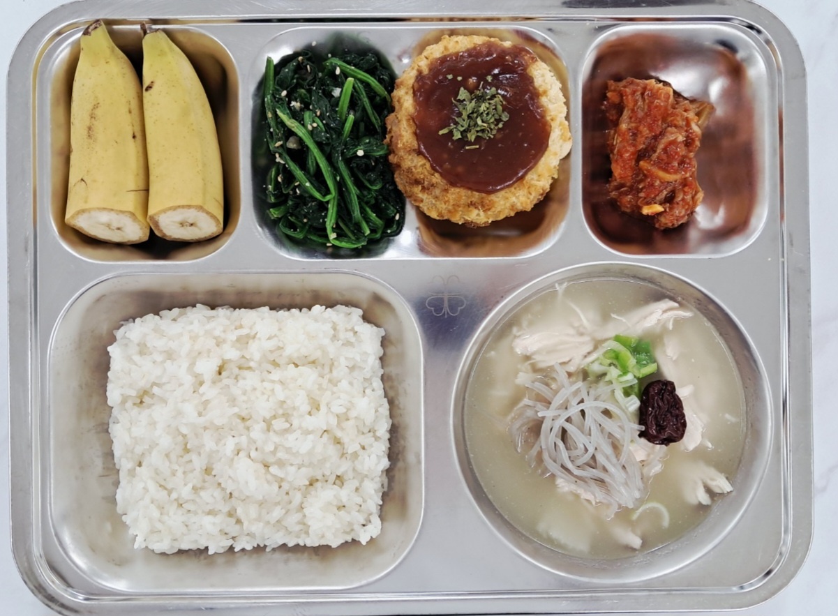 조식 친환경쌀밥(조) -닭곰탕(조)(15) -시금치나물무침(조)(5.6.18) 에그토르티야(1.2.5.6.10.12.18) 배추김치(자율)(9) 바나나