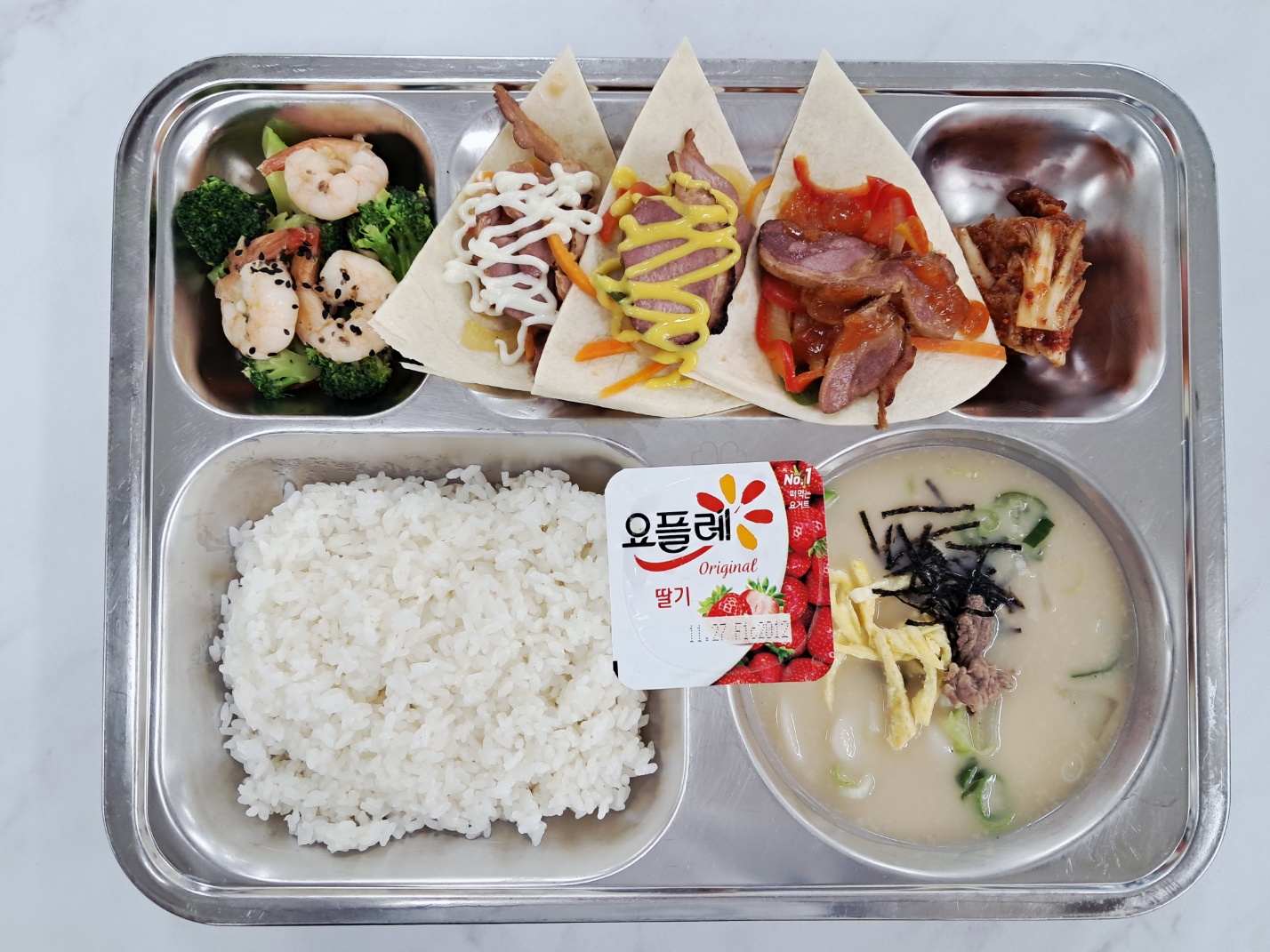 조식 친환경쌀밥(조) -사골떡국(조)(1.16) -새우브로콜리볶음(조)(9.13) 훈제오리화이타&또띠아쌈(1.2.5.6.12.13.18) 배추김치(자율)(9) -딸기요거트(2)