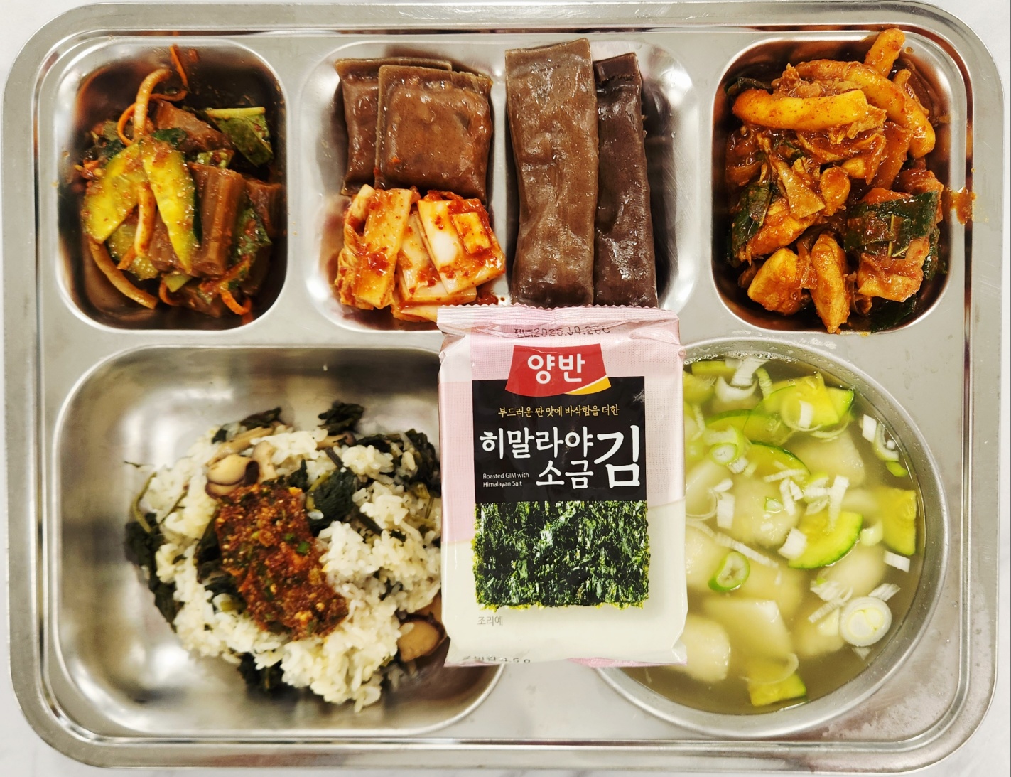 중식 곤드레밥/양념장(5.6.13) 전통옹심이국(5.6.17) 도토리묵무침(자율)(5.6.13) -춘천닭갈비(2.5.6.12.13.15.16.18) -메밀전병(반반)(2.3.5.6.16.18) 배추김치(자율)(9) 도시락김 * 에너지/단백질/칼슘/철 964.69/44.40/155.25/3.13