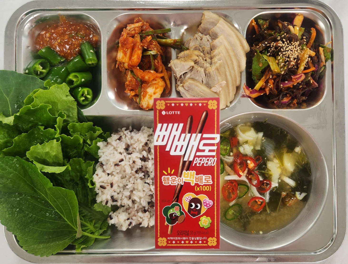 중식 흑미밥 -비빔막국수(3.5.6.13) -건새우아욱국(조)(5.6.9) -돼지고기수육(5.6.10.13) 모듬쌈&쌈장(5.6.13) 수제생배추겉절이(9) 초코빼빼스틱(1.2.5.6) * 에너지/단백질/칼슘/철 913.91/57.56/205.66/3.8