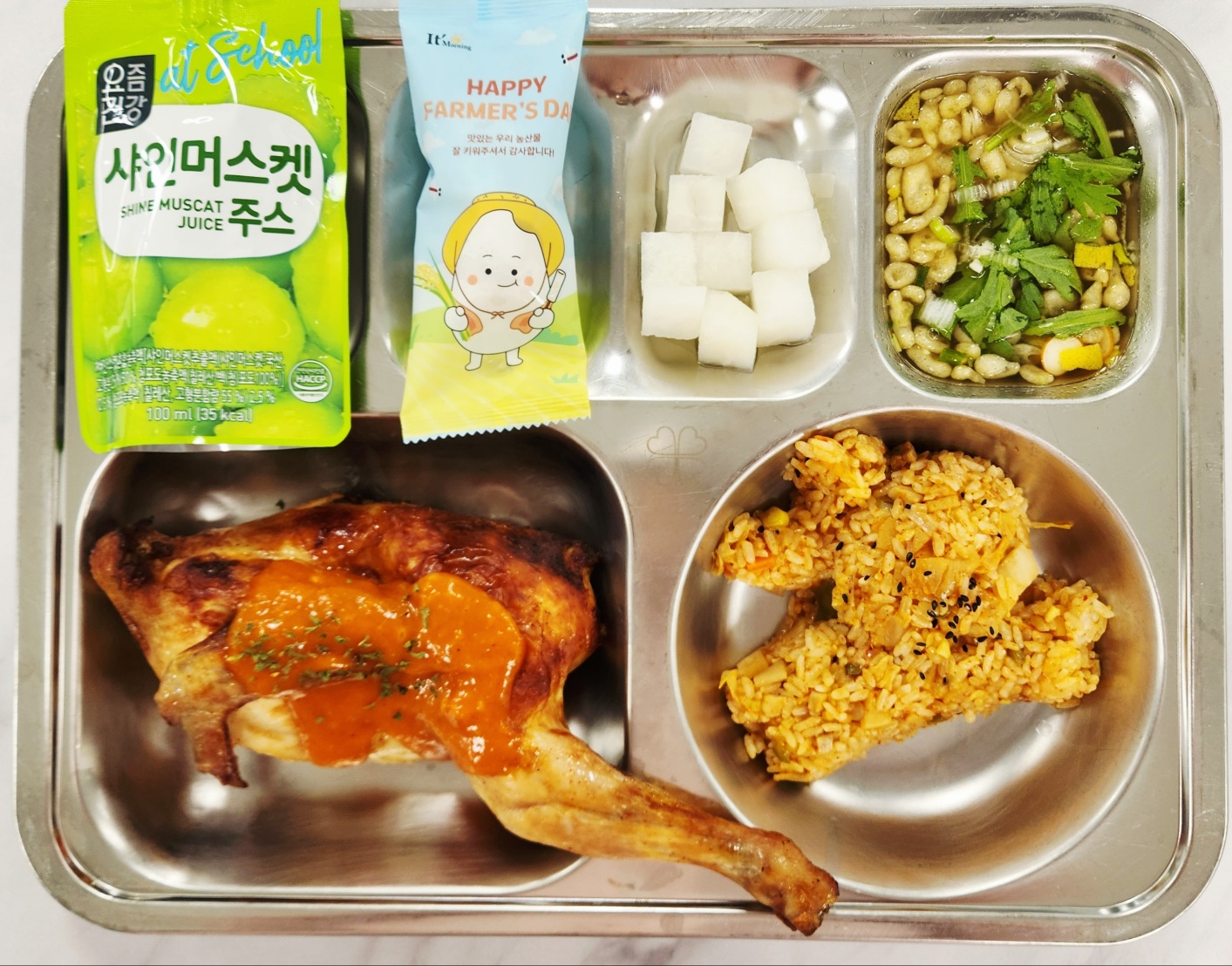 석식 *김치볶음밥(1.2.5.6.9.10.13.15.16.18) -가쓰오장국(1.2.5.6.7.9.13.18) -반마리옛날통닭구이(5.6.12.13.15) 치킨무(자율) -샤인머스캣주스(13) 앙버터가래떡(6)