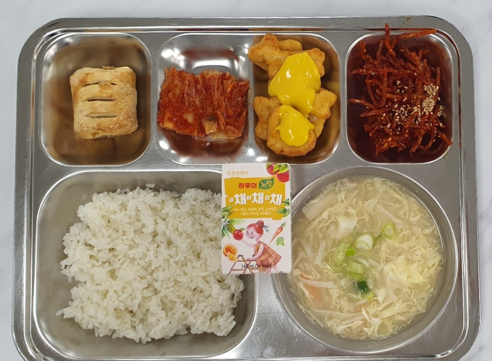 조식 친환경쌀밥(조) 사과파이(1.2.5.6) 게살누룽지탕(1.5.6.15) 쥐포채볶음(고추장)(5.6.13) -치킨너겟/머스터드(조)(1.2.5.6.15) 배추김치(자율)(9) *과채음료(13)