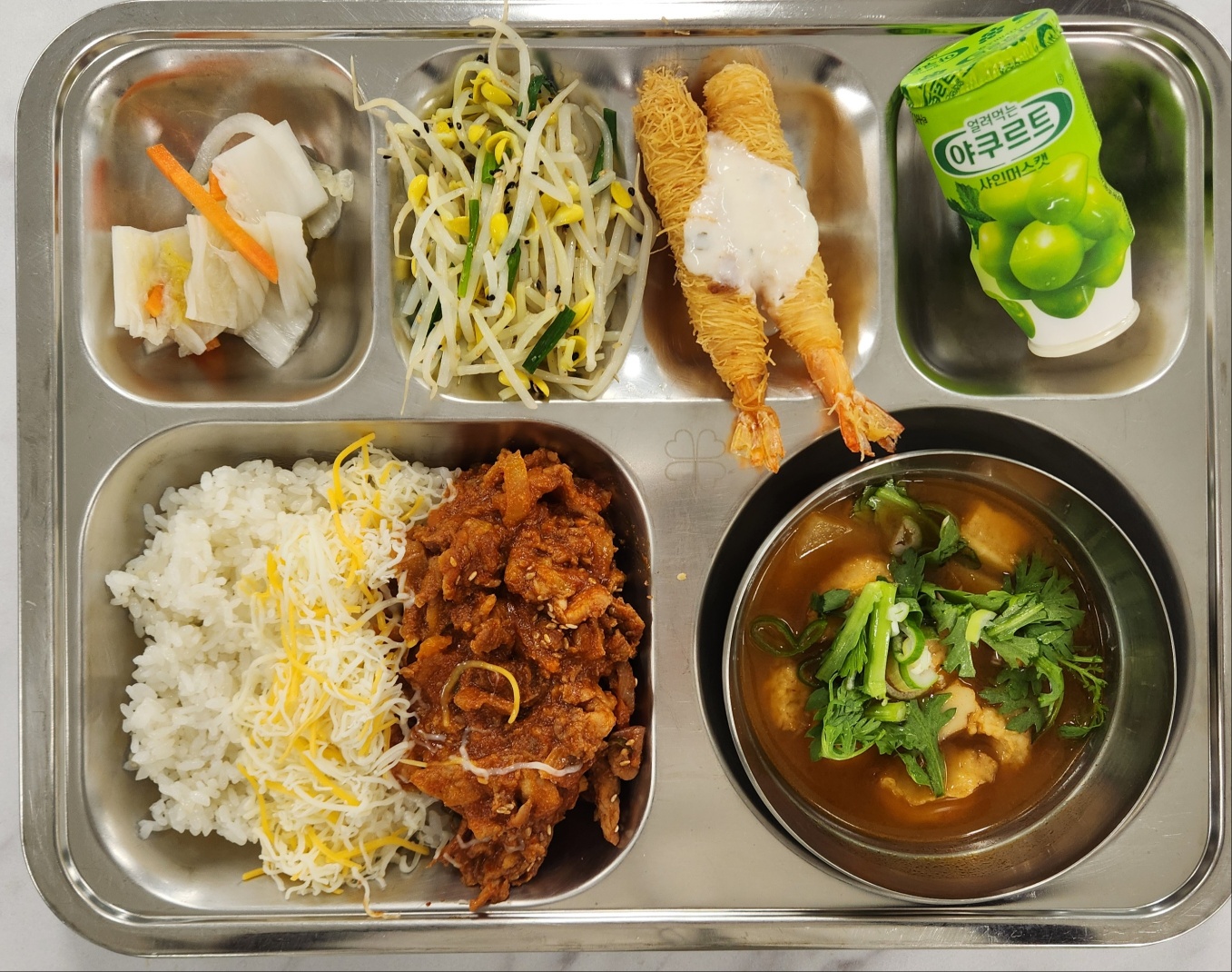 석식 눈꽃치즈제육덮밥(2.5.6.10.12.13) 얼큰어묵국(1.5.6.18) 콩나물무침(자율)(5.6.18) 카다이프새우튀김(1.5.6.9.12.13) 백김치(9) 얼려먹는요구르트(2)