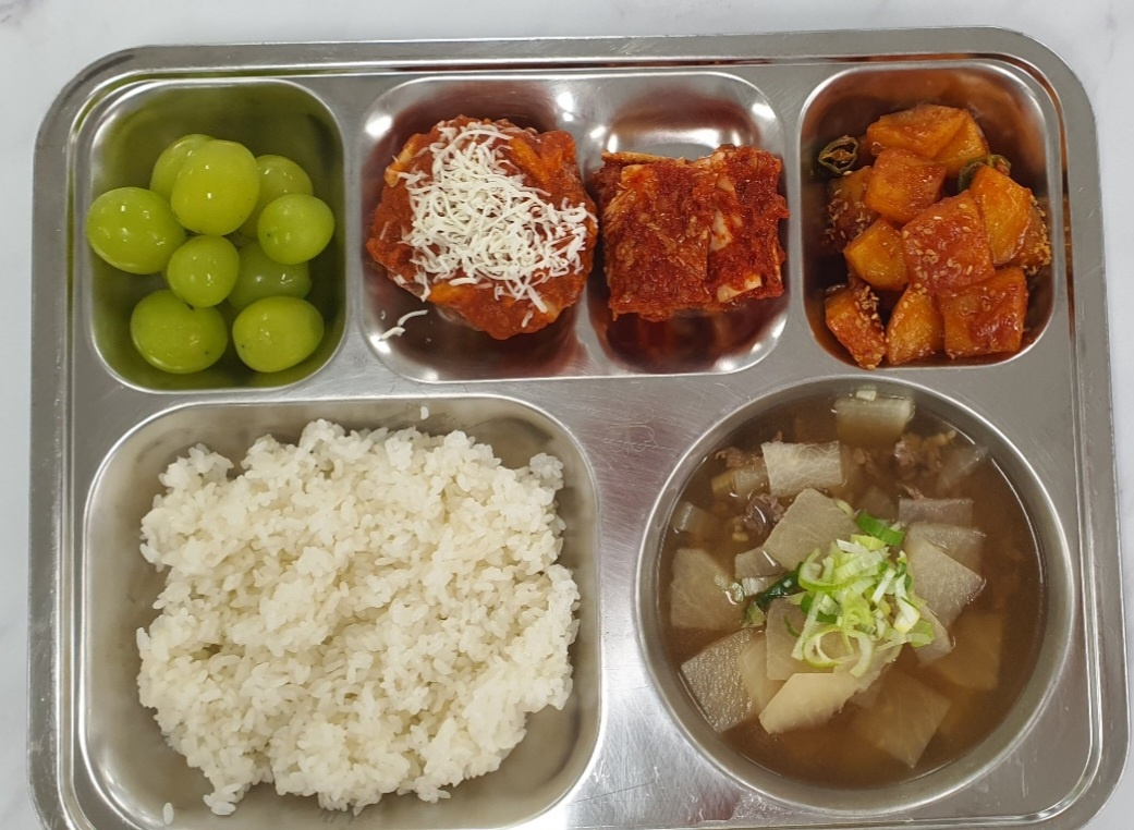 조식 친환경쌀밥(조) 미트칠리계란함박(1.2.5.6.10.12.13.15.16) -쇠고기뭇국(조)(5.6.16) -매콤감자조림(5.6.13) 배추김치(자율)(9) -샤인머스캣