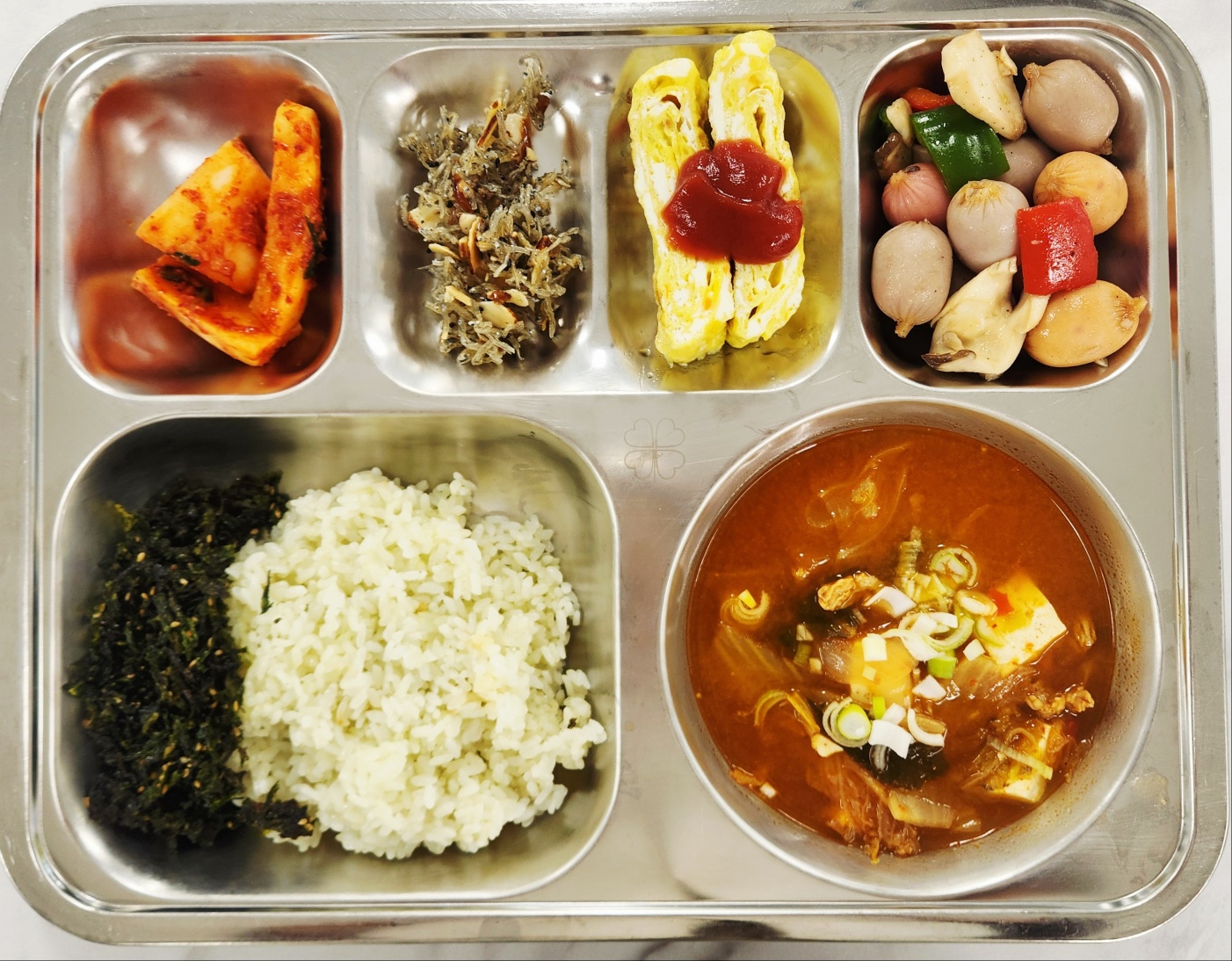 중식 클로렐라밥(친) -돈육김치찌개(5.9.10)->김치콩나물국 조리부주의(화근내)로 인한 메뉴변경 김자반볶음.(5) -캠핑소시지볶음(조)(1.2.5.6.10.15.16) 멸치아몬드볶음(자율)(13) -달걀말이(케첩)(1.12) *총각김치(9) * 에너지/단백질/칼슘/철 970.54/50.47/210.94/5.9