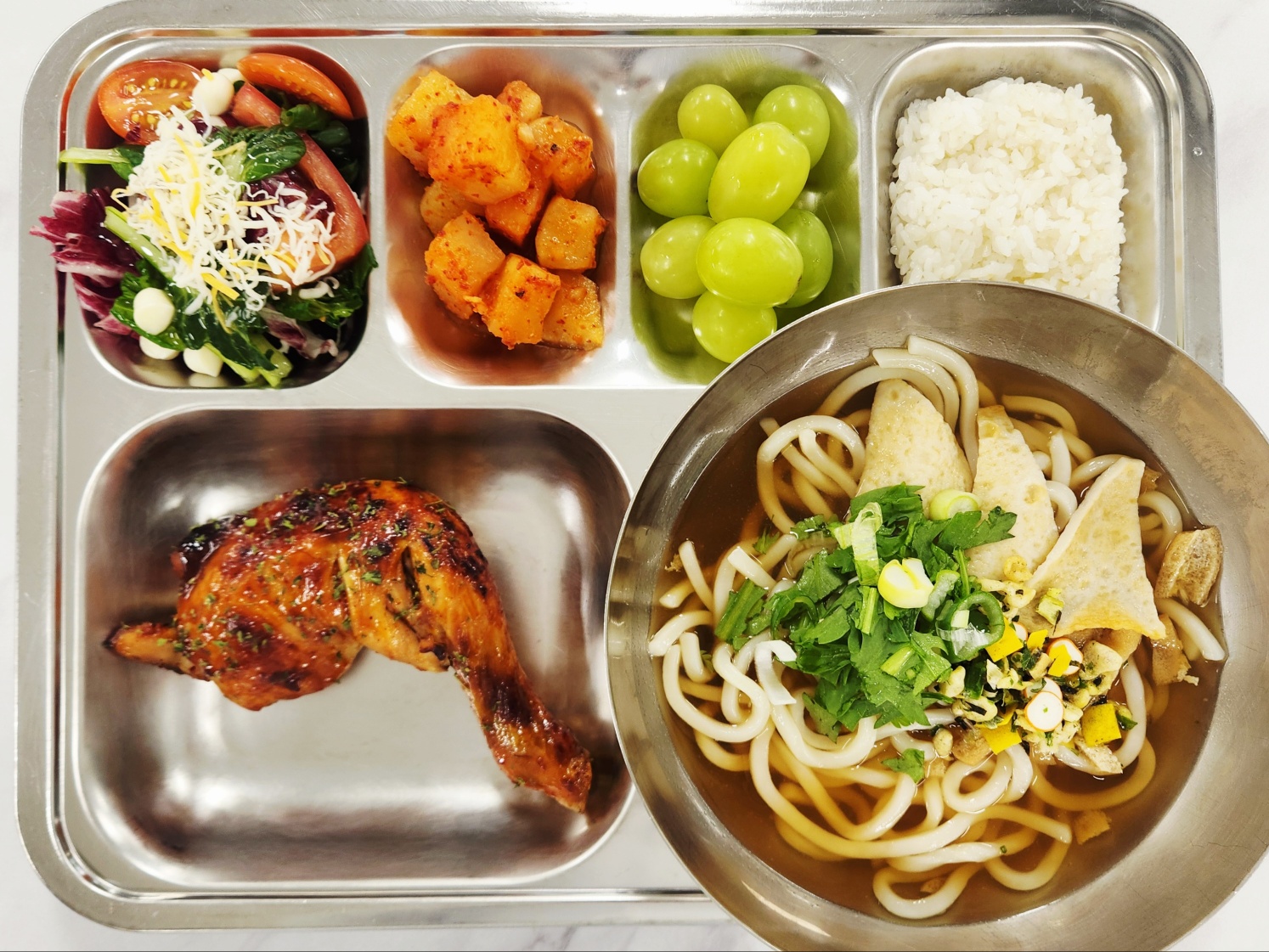 자율밥유부우동(면기)(1.2.5.6.7.9.18)꿀토마토샐러드(2.12)오꾸닭(장각)(6.12.13.15)-깍두기(9)청포도* 에너지/단백질/칼슘/철960.73/42.96/187.06/2.46