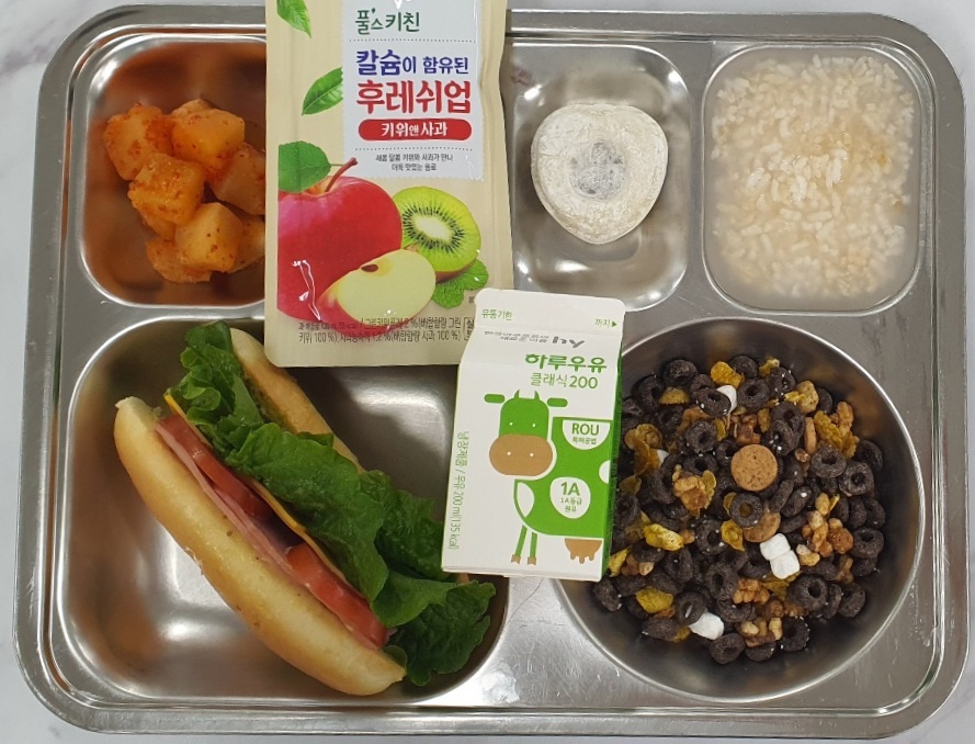 브리오쉬샌드위치(1.2.5.6.10.12.13.15.16)숭늉&깍두기(조)(9)-모듬시리얼&우유(2.5.6)키위사과주스(13)하트찹쌀떡(2.5.6)