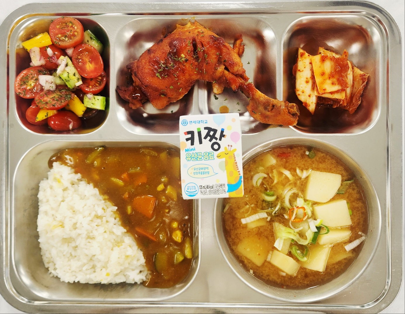 중식 카레라이스(2.5.6.10.12.13.16.18) 감자된장국(5.6) -토마토오이샐러드(2.12.13) 탄두리바베큐(장각).(2.5.6.12.13.15) 배추김치(자율)(9) 유산균음료(2) * 에너지/단백질/칼슘/철 880.71/43.18/156.29/2.80