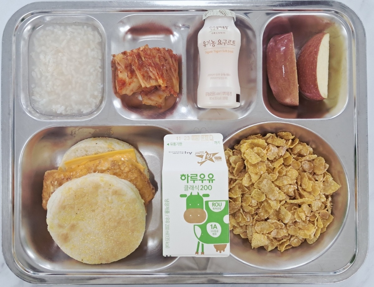 조식 모닝투움바머핀(1.2.5.6.12.13.15.18) 숭늉&배추김치(조)(9) -콘시리얼&우유.(2.5.6) -유기농요구르트(2) 사과