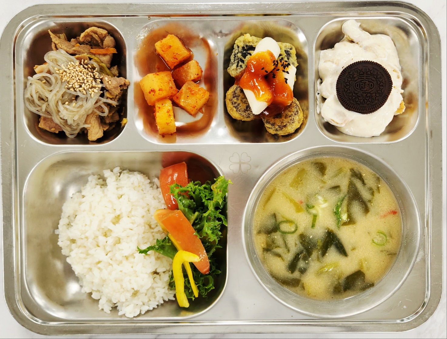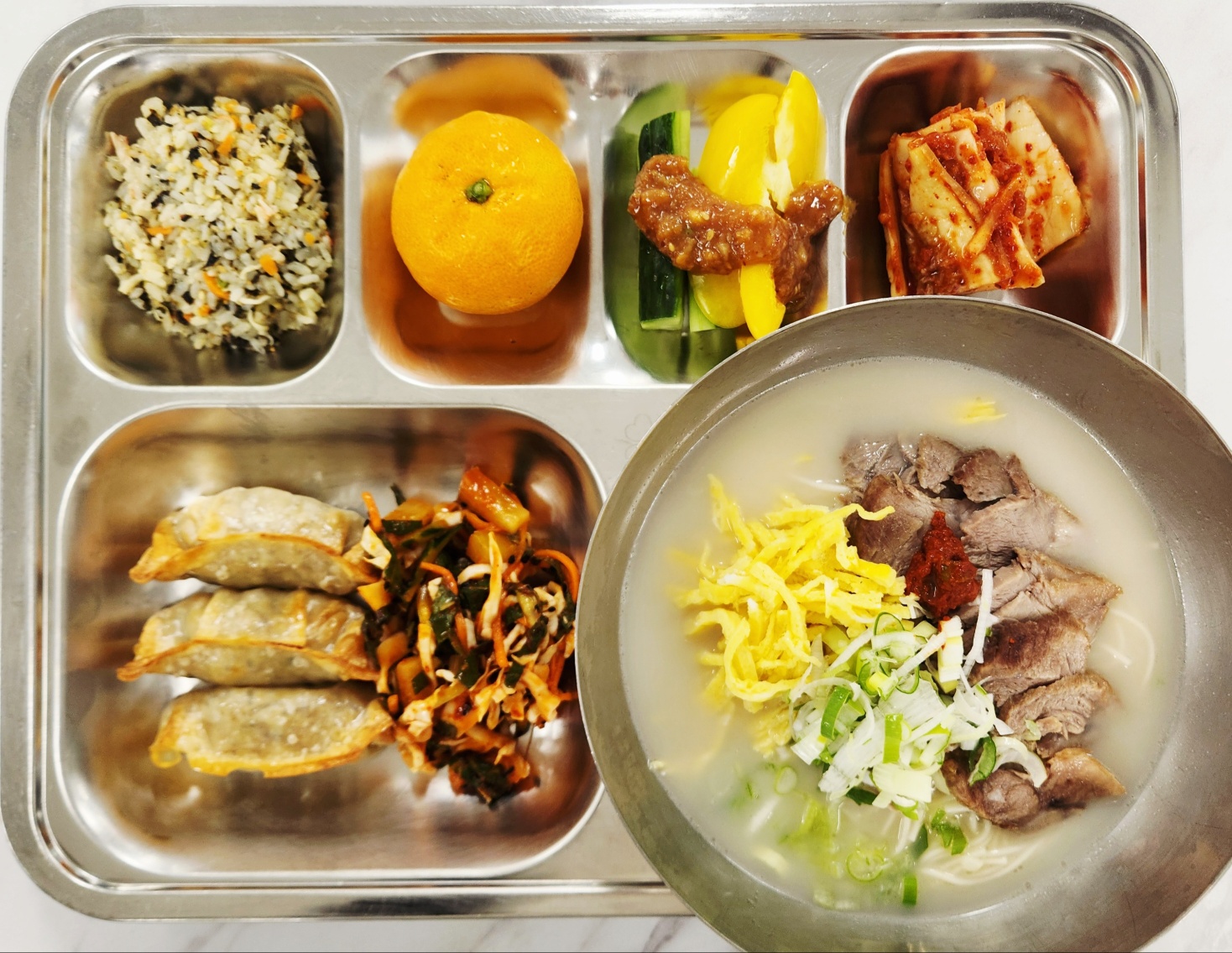 중식 대게살볶음밥(미니)(1.2.5.6.8.9.13.16.18) -고기국수(면기)(1.2.5.6.10.16) 야채스틱(자율) -비빔만두(1.5.6.10.11.13.16.18) 배추김치(자율)(9) -밀감 * 에너지/단백질/칼슘/철 1,001.96/59.98/196.99/7.47
