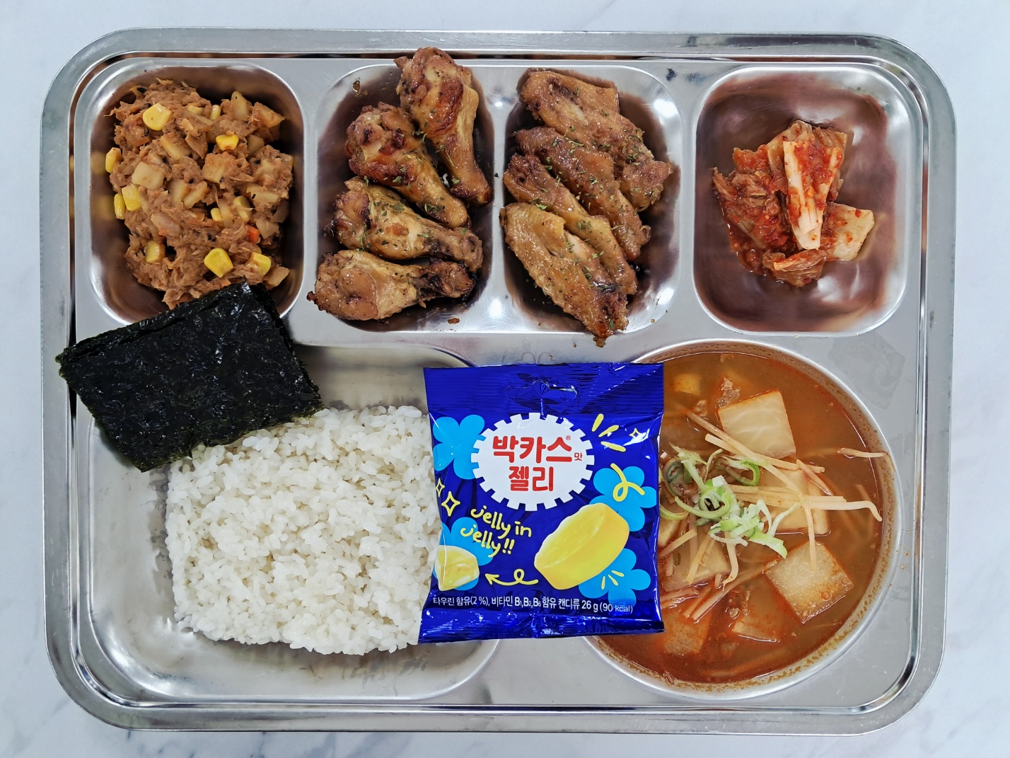 조식 친환경쌀밥(조) -경상도식쇠고기뭇국(5.6.16) -고추참치김쌈(5.6.13) 로스트닭봉윙구이(5.6.12.13.15) 배추김치(조)(9) 비타민젤리