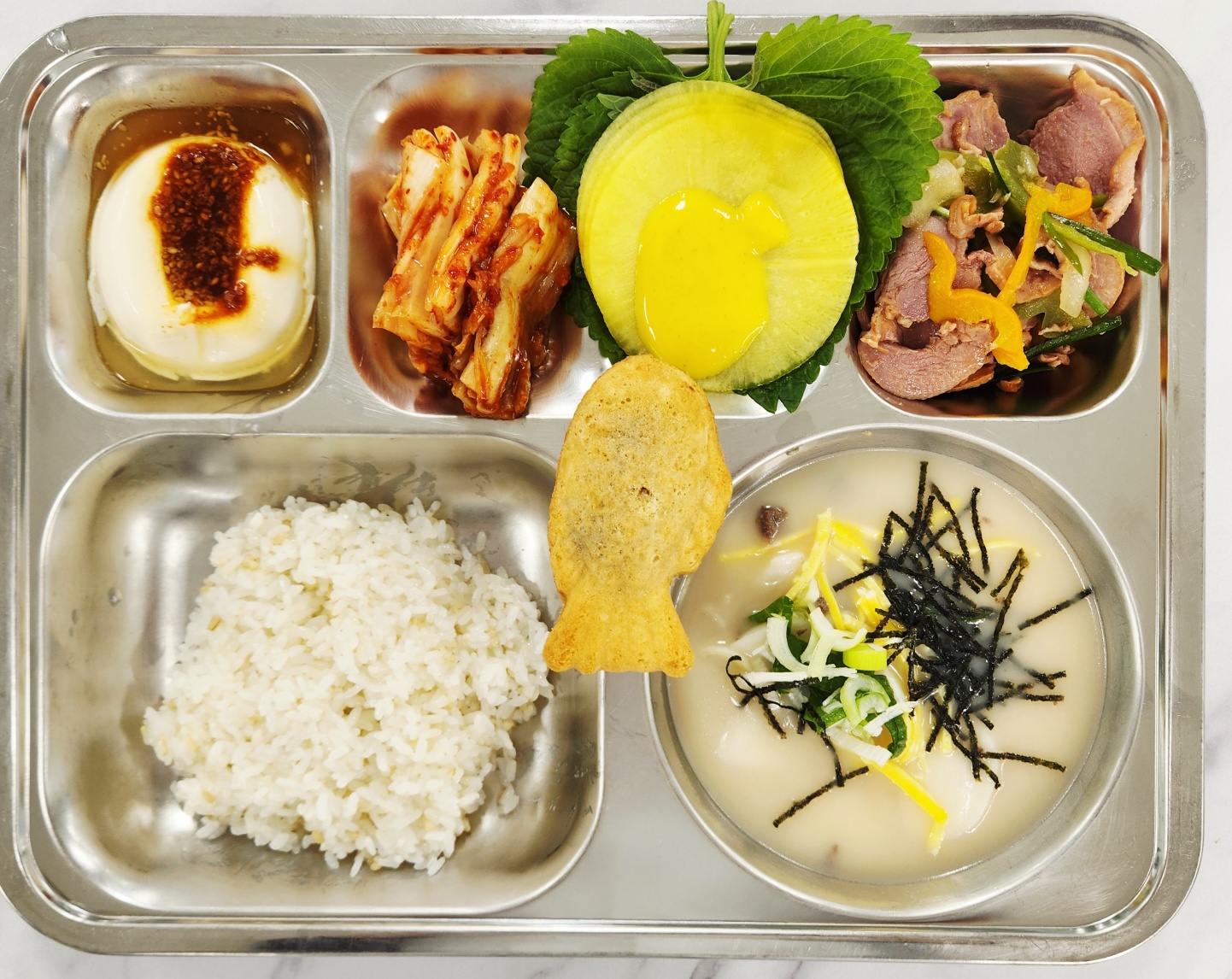 중식 현미밥 붕어빵(1.2.5.6.16) -사골떡국(조)(1.16) -연두부/양념장(5.6) 훈제오리야채볶음(1.2.5.6)배추김치(자율)(9) -깻잎&레몬무쌈 * 에너지/단백질/칼슘/철 991.11/37.45/128.73/2.74