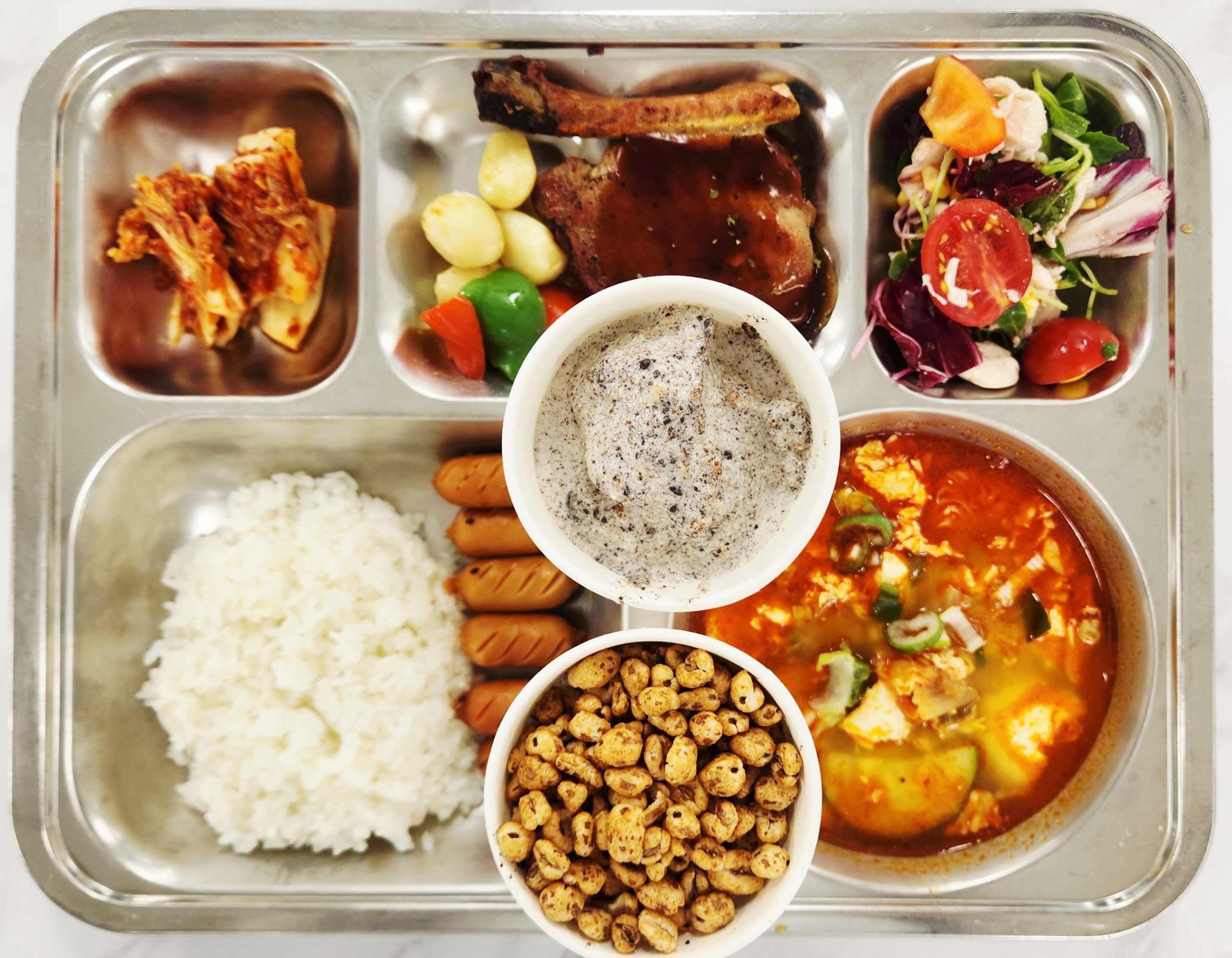 석식 *친환경쌀밥 -순두부찌개(1.5.6.9.10.13.18) 비엔나케찹볶음(1.2.5.6.10.12.13.15.16) 쿠스쿠스닭가슴살샐러드(자율)(1.2.5.6.12.13.15) 돈마호크(130g)(2.5.6.10.12.13.16) 배추김치(자율)(9) 죠리퐁라떼(수제)(1.2.5.6)