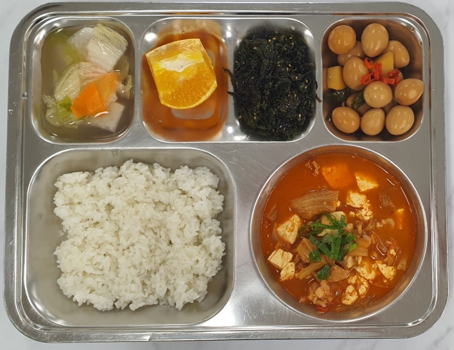 조식 친환경쌀밥(조) -돈육김치찌개(조)(5.9.10) 김자반볶음.(5) -메추리알장조림(조)(1.5.6.13) -나박물김치(조)(9) -황금향